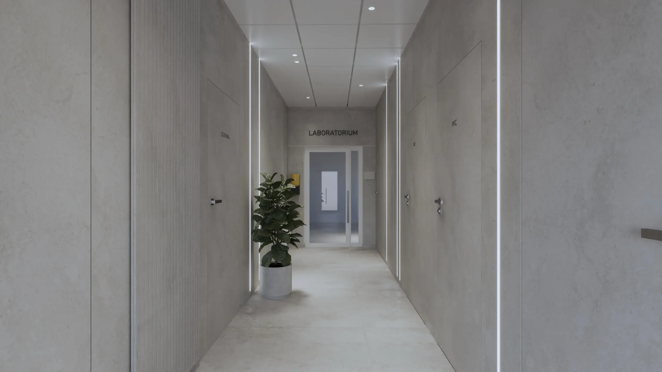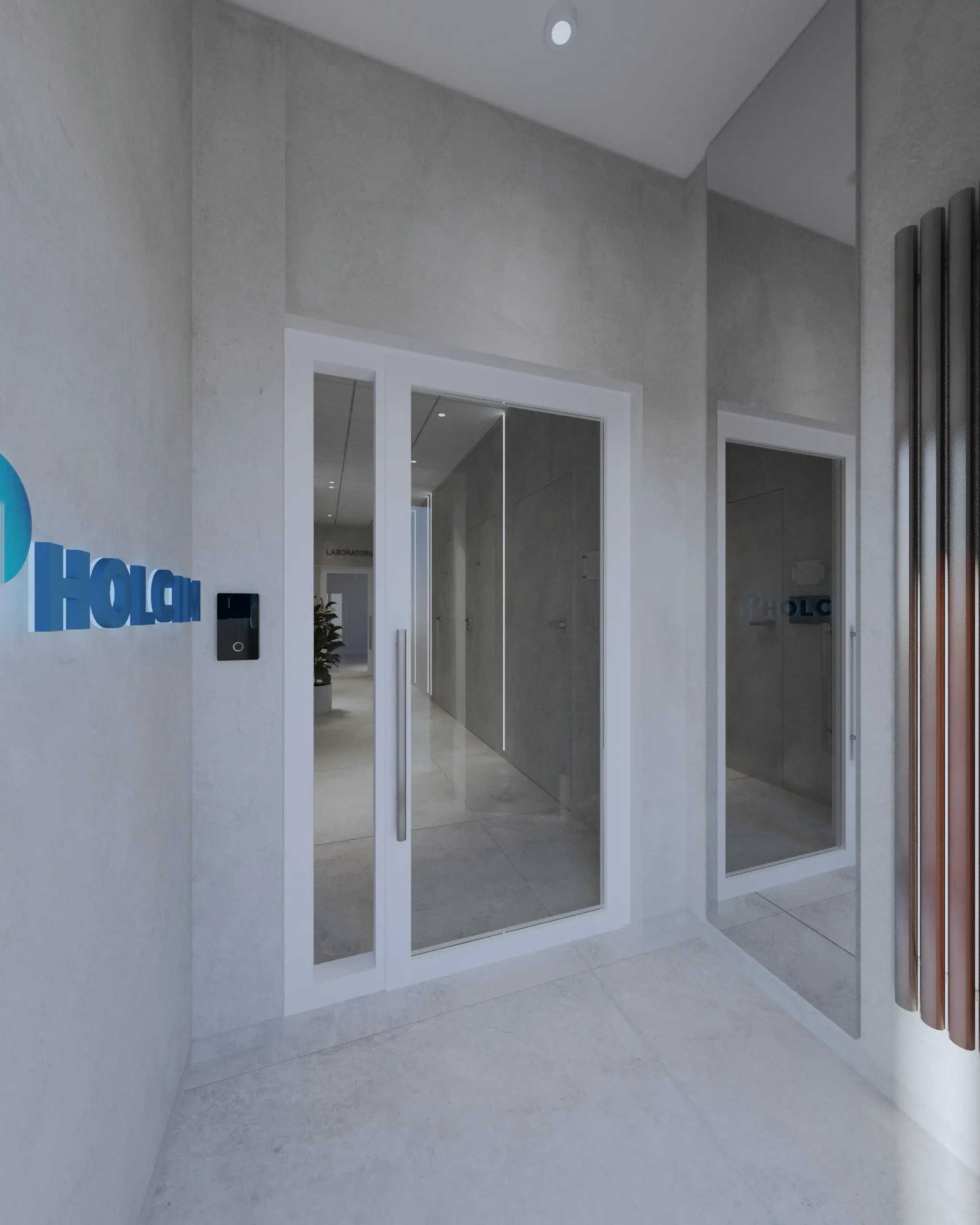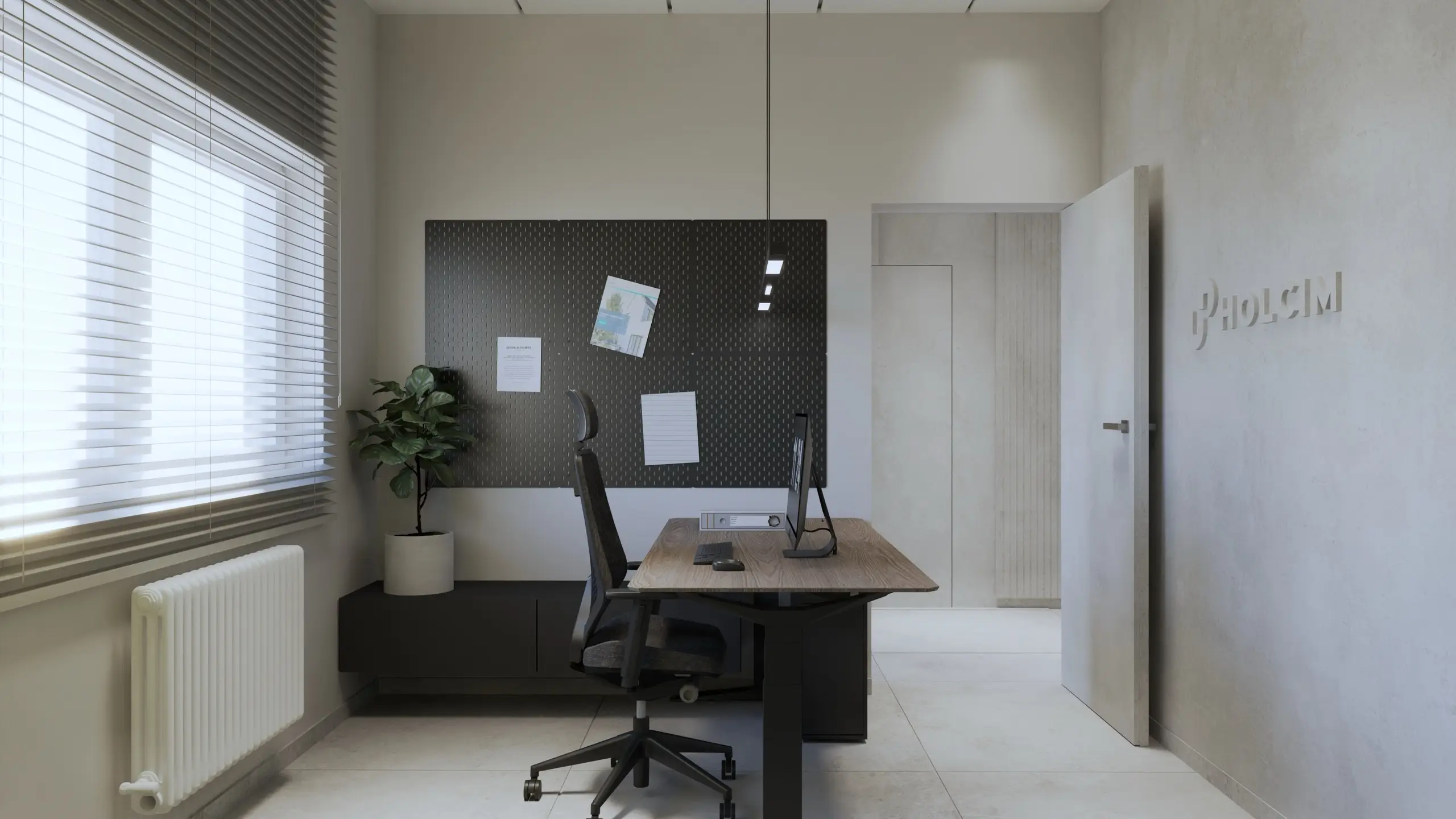 Przestrzeń biurowa została poddana pełnemu remontowi. Zachowując pierwotny plan budynku, stworzony został na nowo układ funkcjonalny zwiększający efektywność pracowników. Jasną i reprezentacyjną strefę wejściową wyróżnia czytelna komunikacja. Zastosowane na ścianach wykończenie z betonowego tynku, wyraźnie nawiązuje do specjalności firmy.