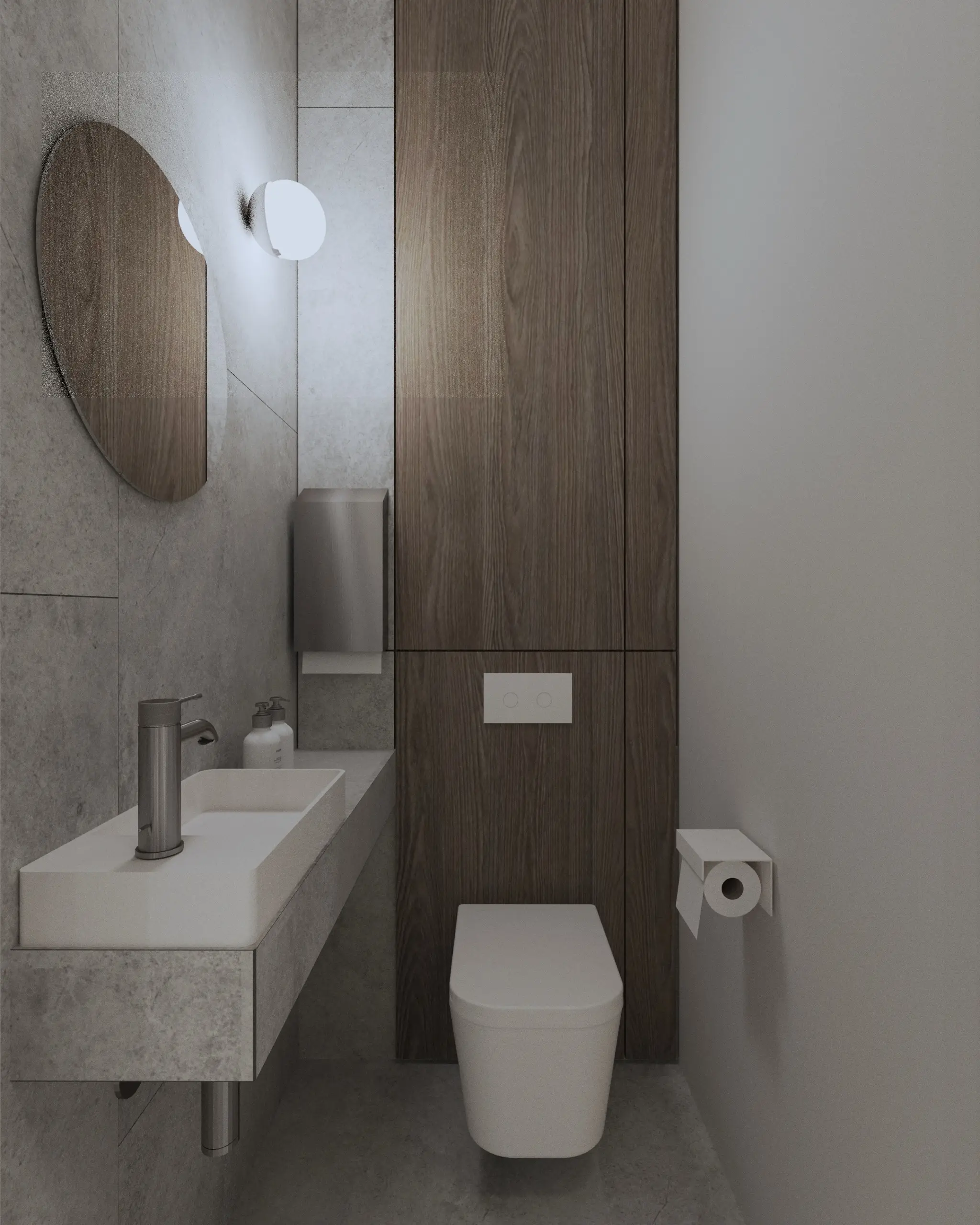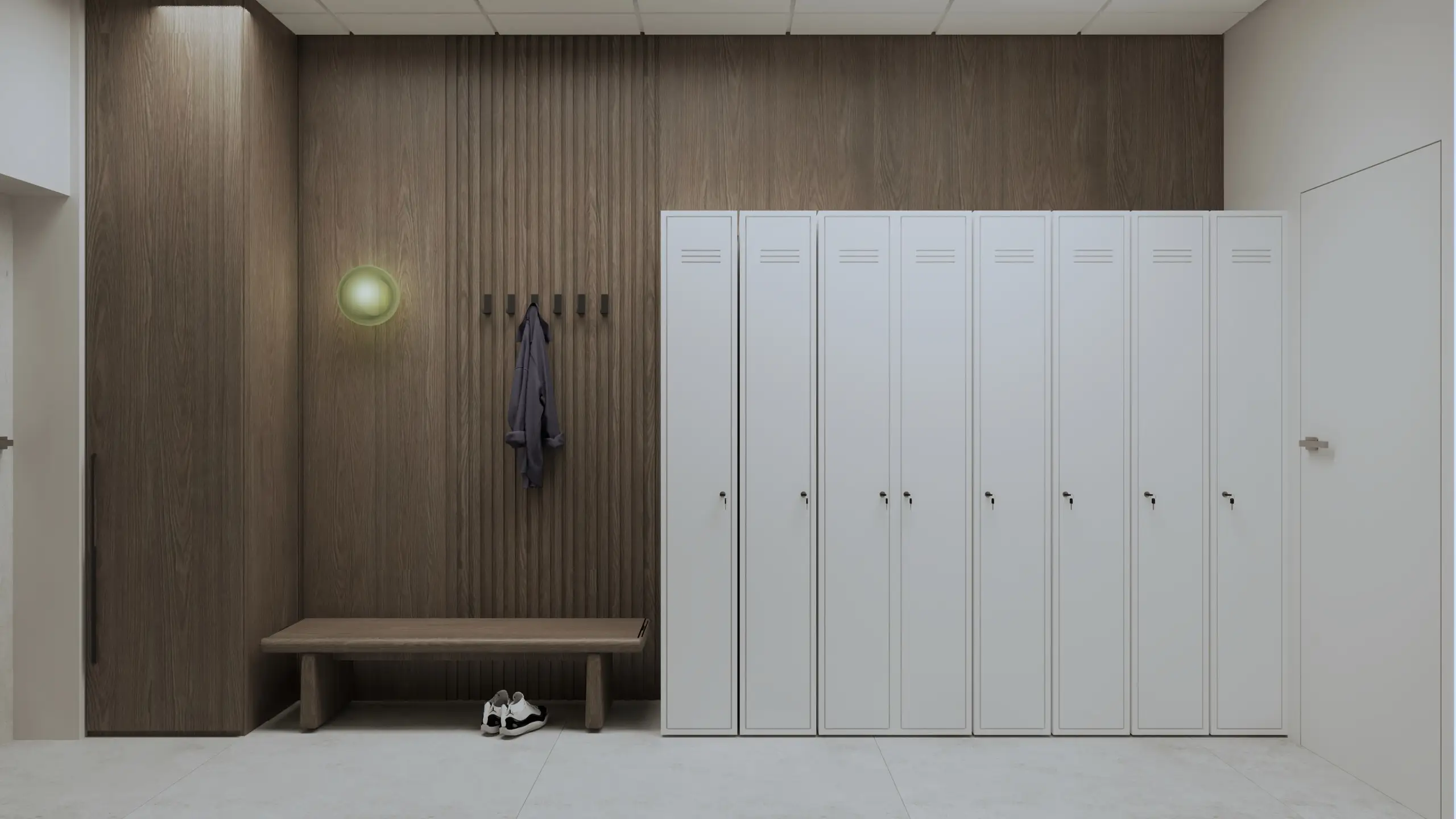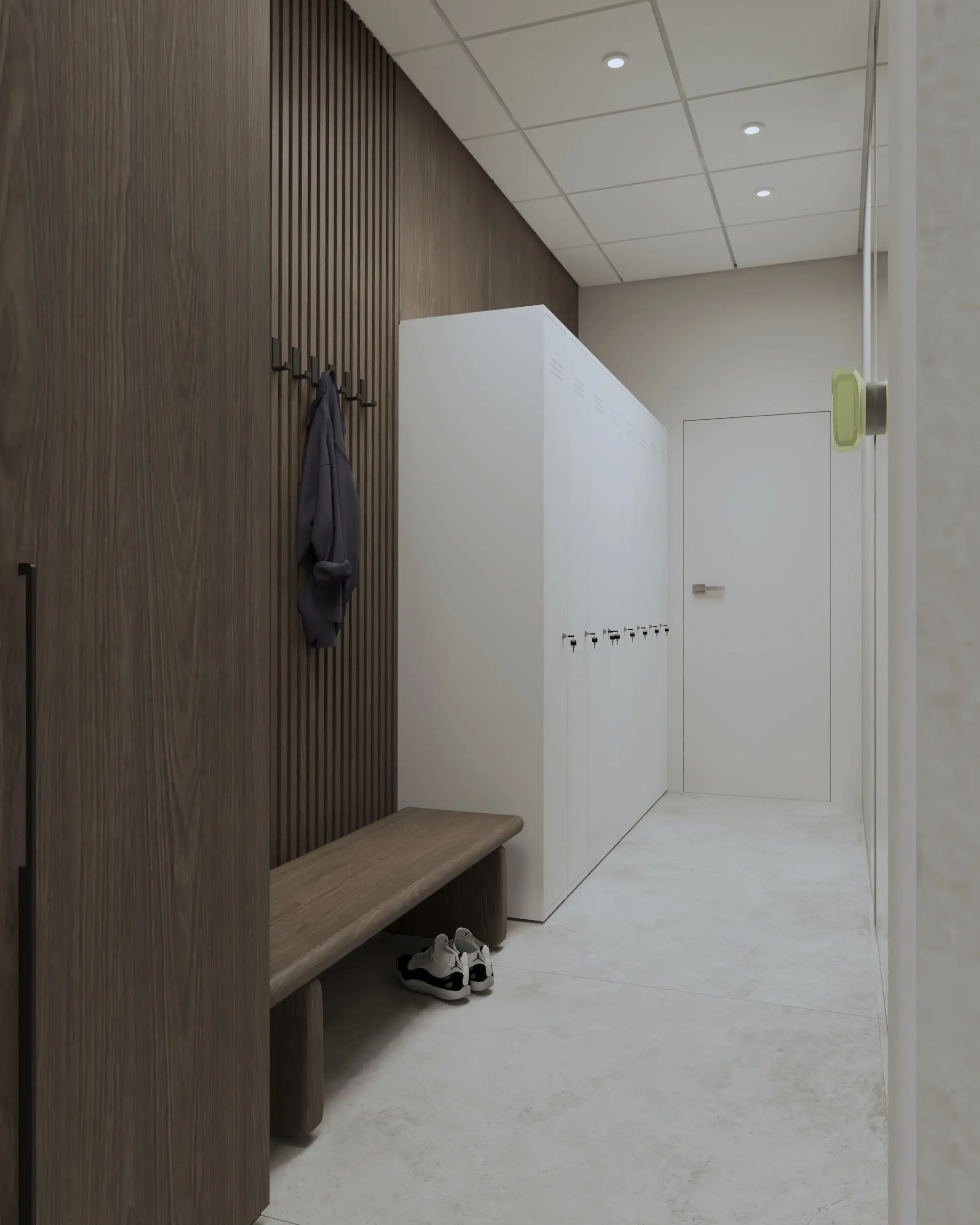 Jasna paleta barw ocieplona drewnem została przeniesiona także do pomieszczeń socjalnych tj. szatnia pracownicza czy toaleta.
