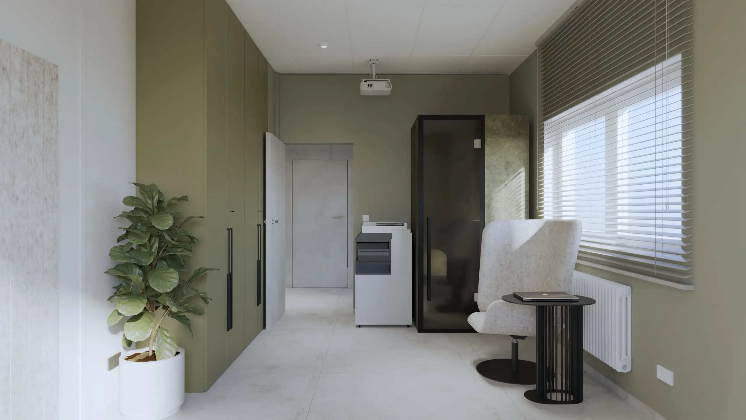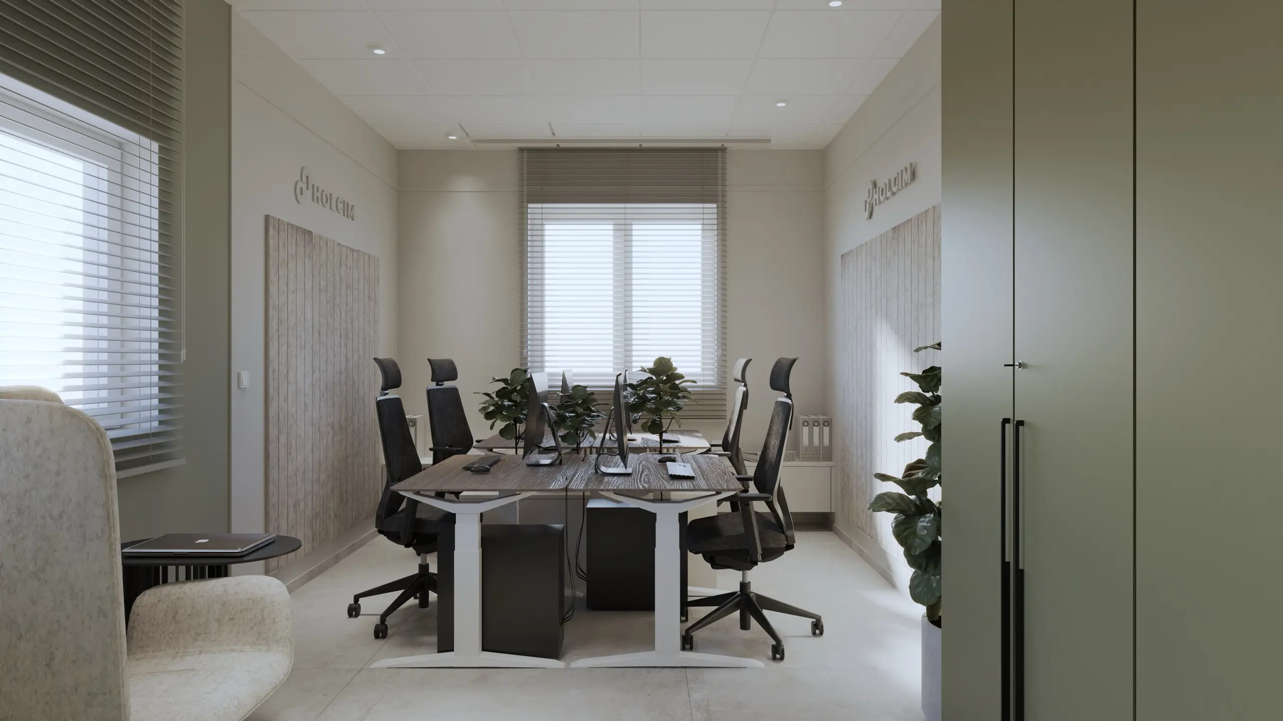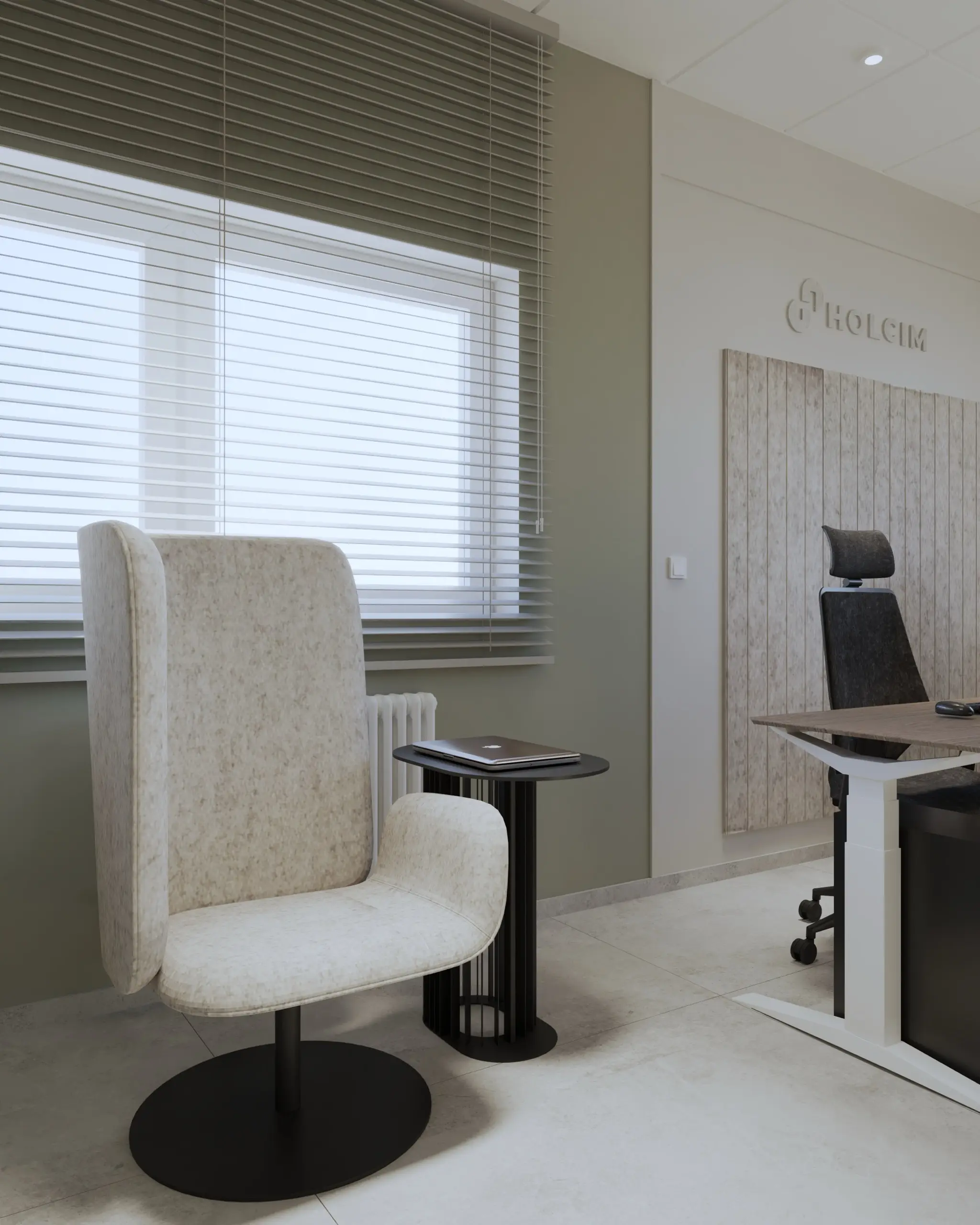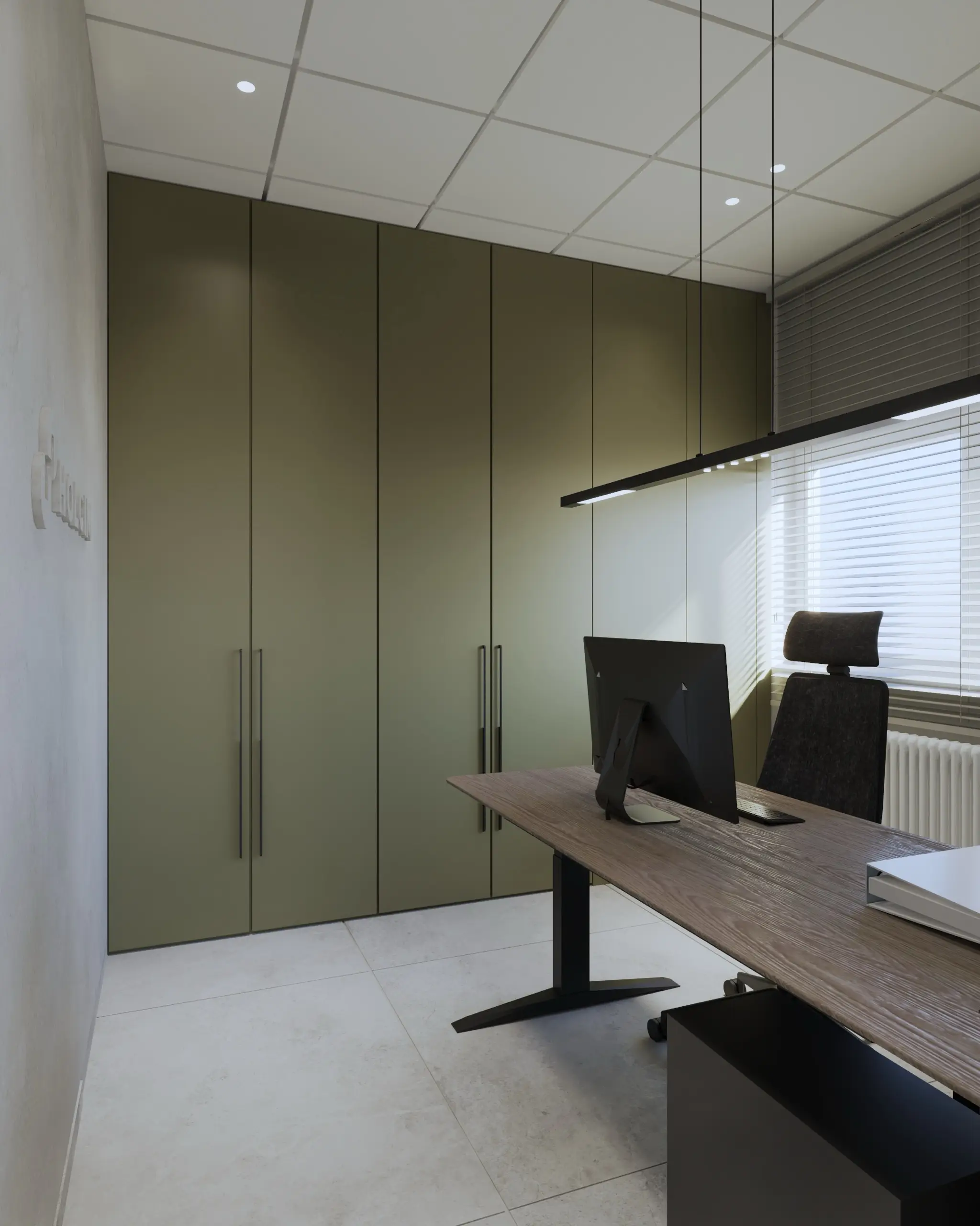 W gabinetach spokojne barwy zestawione zostały z energetycznym dodatkiem zieleni w postaci elementów meblowych ale także dużej ilości roślin we wnętrzu. Ergonomiczne meble oraz rozwiązania dbające o komfort pracy w wieloosobowym biurze, takie jak na przykład kabina akustyczna, dźwiękochłonne panele czy fotel wypoczynkowy w pozytywny sposób oddziałują na dobrostan wszystkich użytkowników.