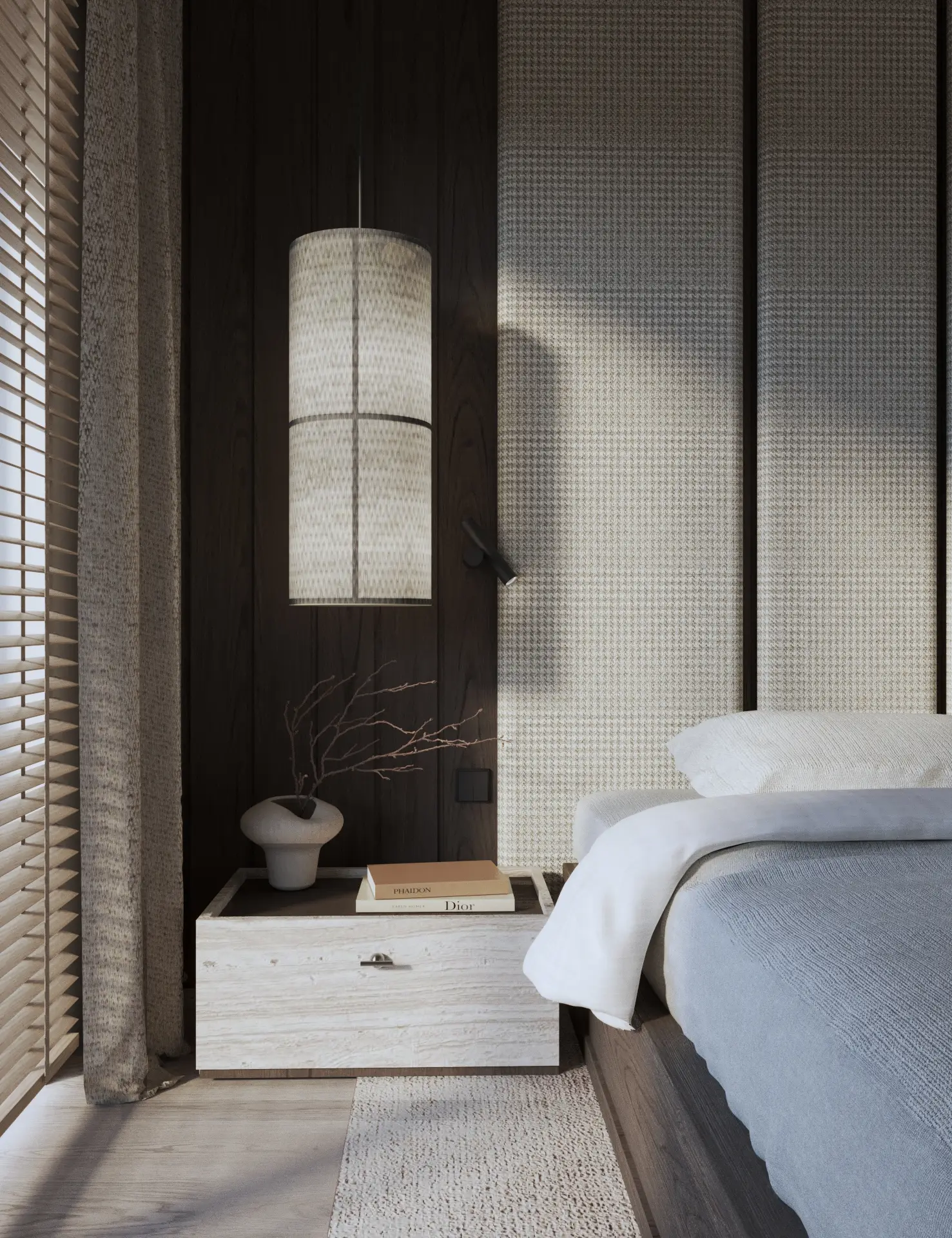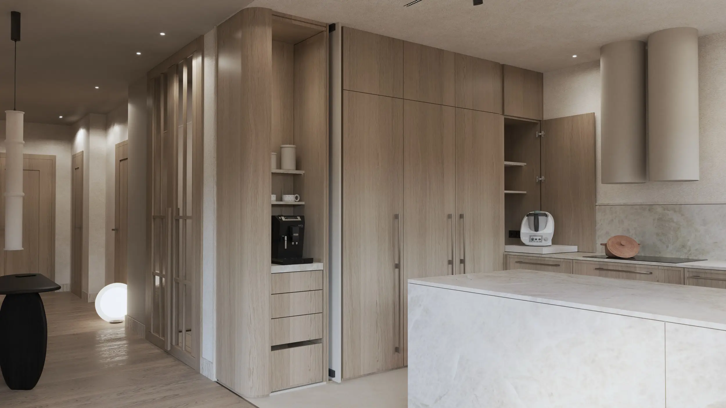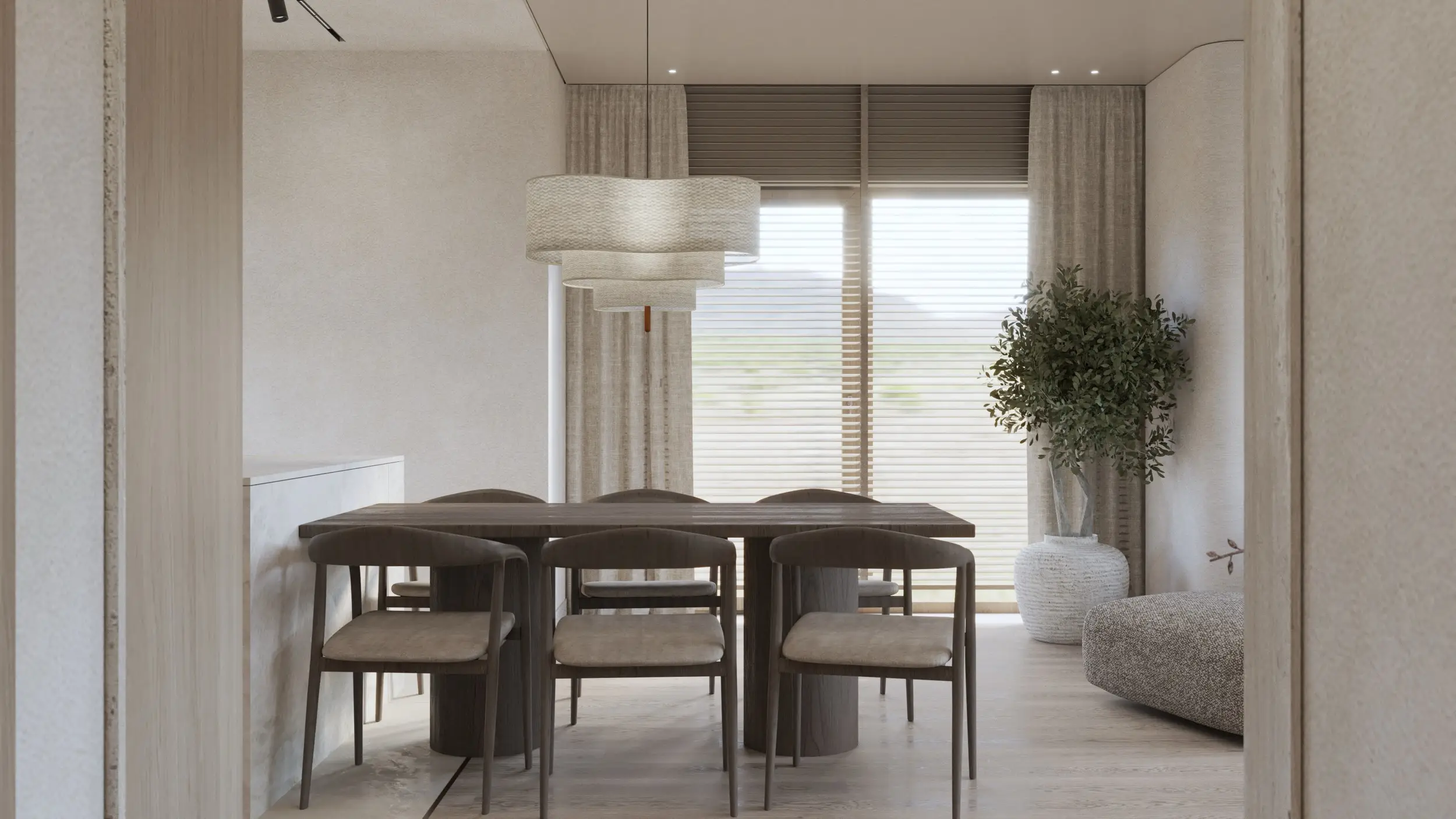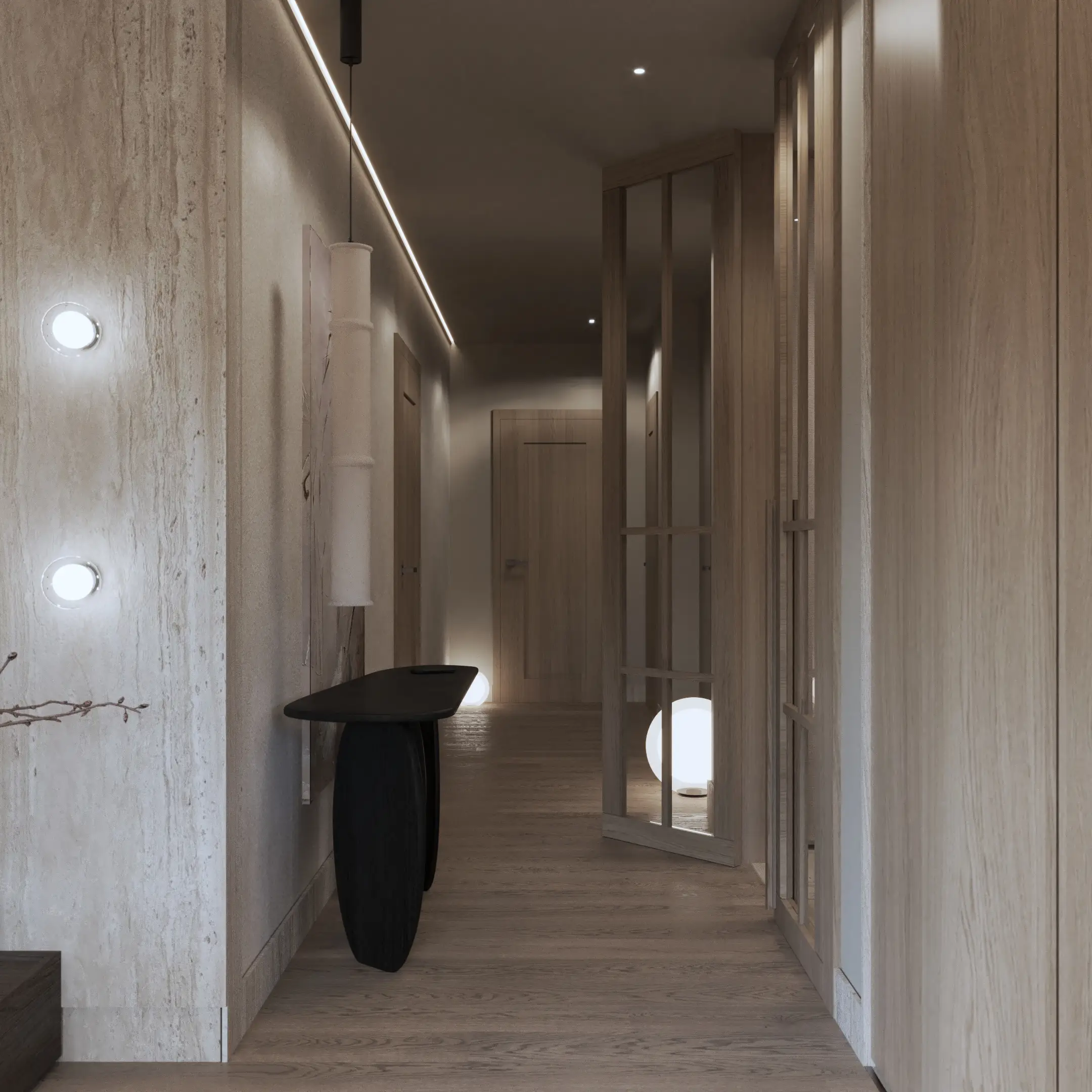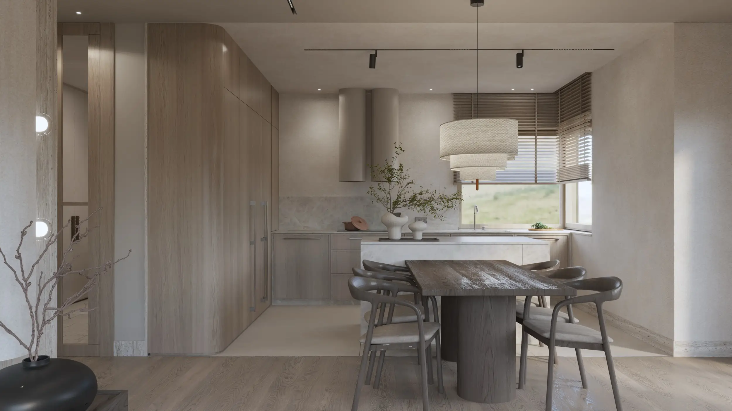 Projekt wnętrza domu łączy estetykę japandi z elementami stylu modern farmhouse, tworząc spójną i funkcjonalną przestrzeń do codziennego życia. Centralnym punktem strefy dziennej jest duży drewniany stół , sprzyjający wspólnym posiłkom i spotkaniom. Modułowa sofa, ustawiona na tle dekoracyjnego regału, została zorientowana tak by integrować salon, jadalnię i ogród, podkreślając wielozadaniowość tej części domu. W kuchni zaprojektowano funkcjonalną wyspę z kwarcytu Taj Mahal, długi blat oraz wysoką zabudowę z forniru dębowego, która mieści sprzęty AGD i barek kawowy. Wyjątkowym elementem są wysokie szklane drzwi do wiatrołapu w drewnianej ramie oraz ozdobna kompozycja z konsolą i obrazem. Nieregularnie rozmieszczone oświetlenie w korytarzu, optycznie skraca przestrzeń i dodaje jej przytulności. W sypialni zaprojektowano ażurową ściankę oddzielającą strefy.. Nastrojowe żaluzje i mięsiste zasłony wprowadzają przytulny klimat sprzyjający wyciszeniu oraz poprawiają akustykę. W garderobie znajduje się duża szafa z podświetlanym wnętrzem, małe biurko i duże lustro, które odbija światło z okna. Łazienka master została wyposażona w dużą kabinę prysznicową, podświetlane lustra, monolityczną umywalkę oraz drewniane elementy meblowe. Wyjątkowy klimat do relaksu zapewnia podwieszana wanna osadzona w klimatycznie podświetlanej niszy z elegancką tapetą i kinkietami.