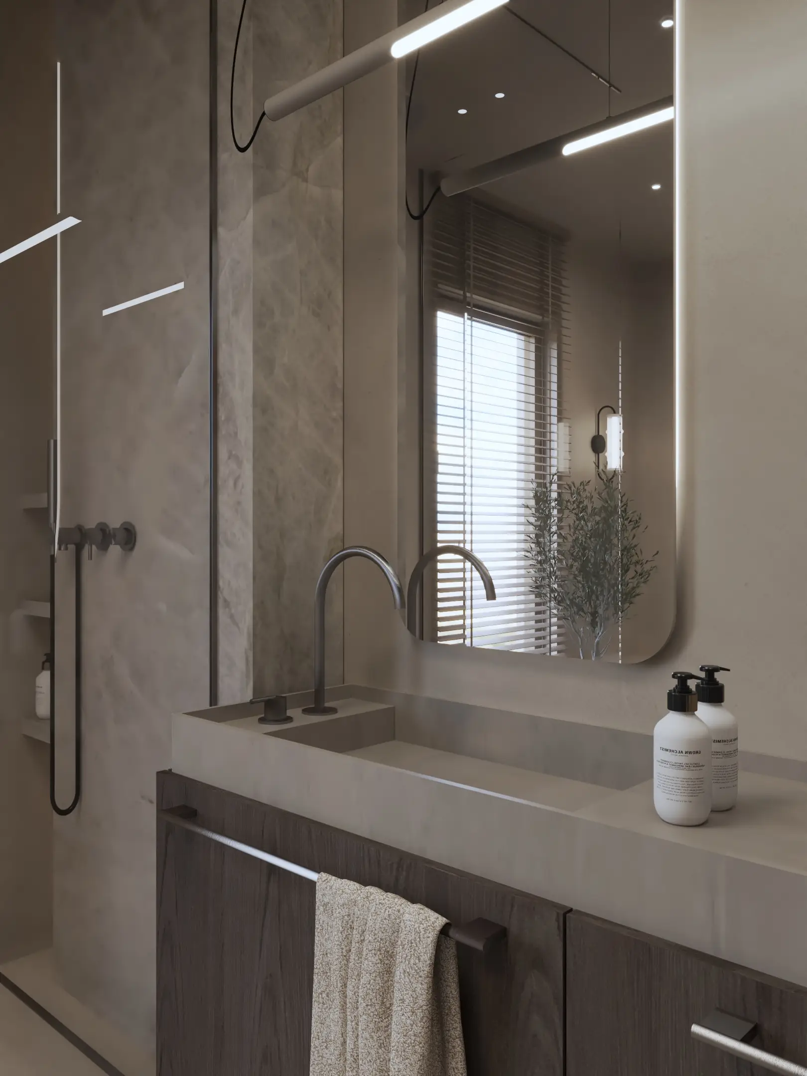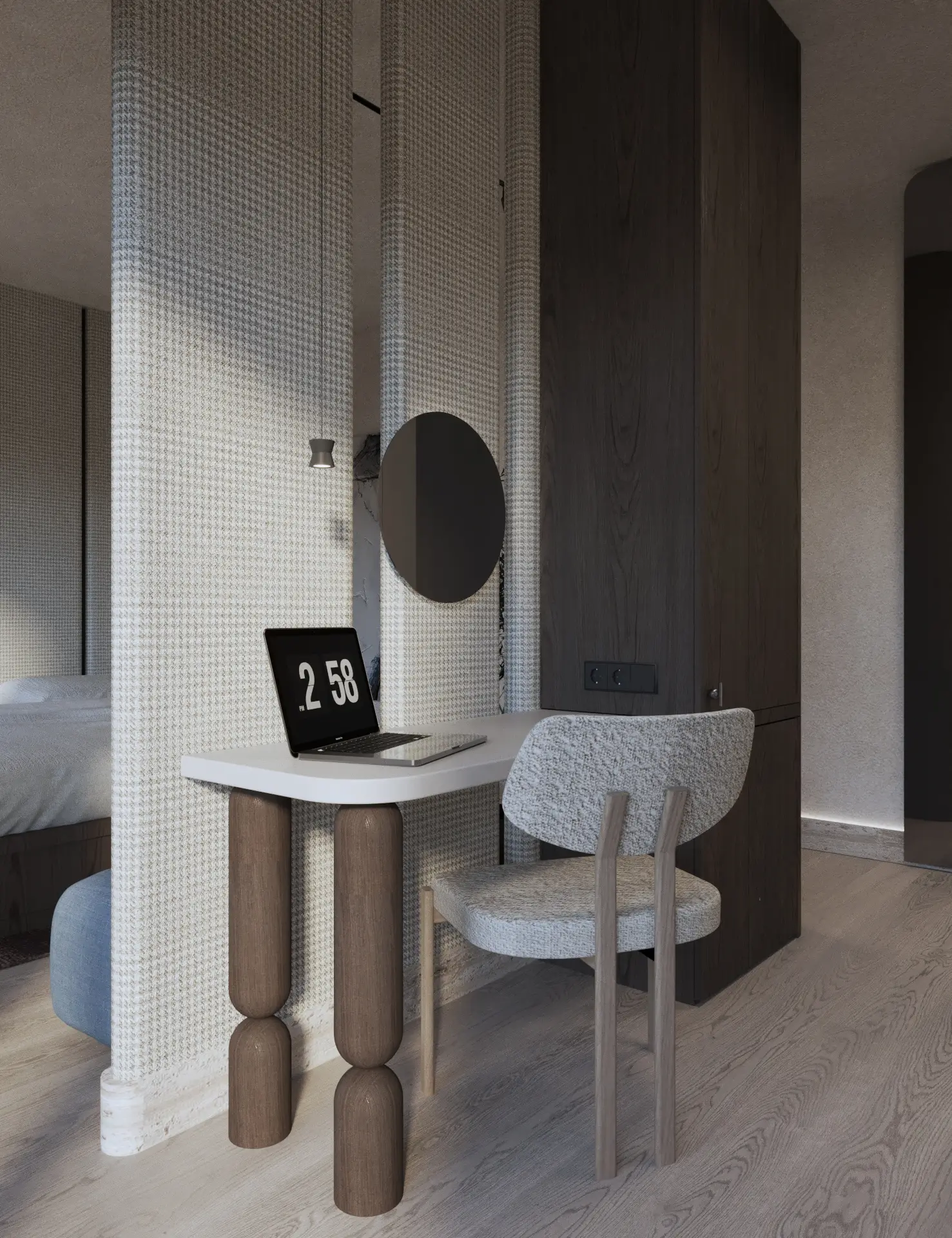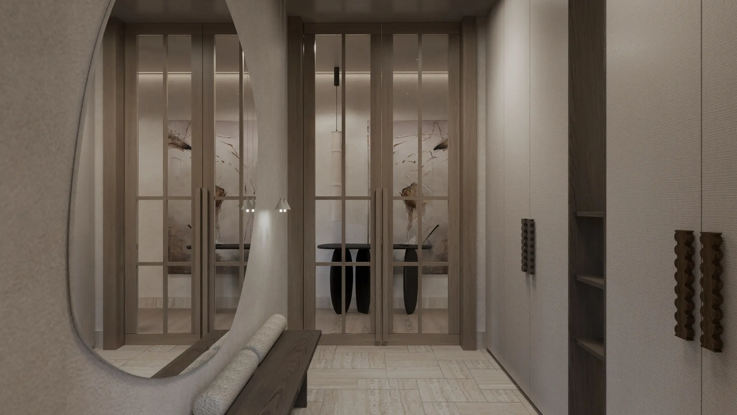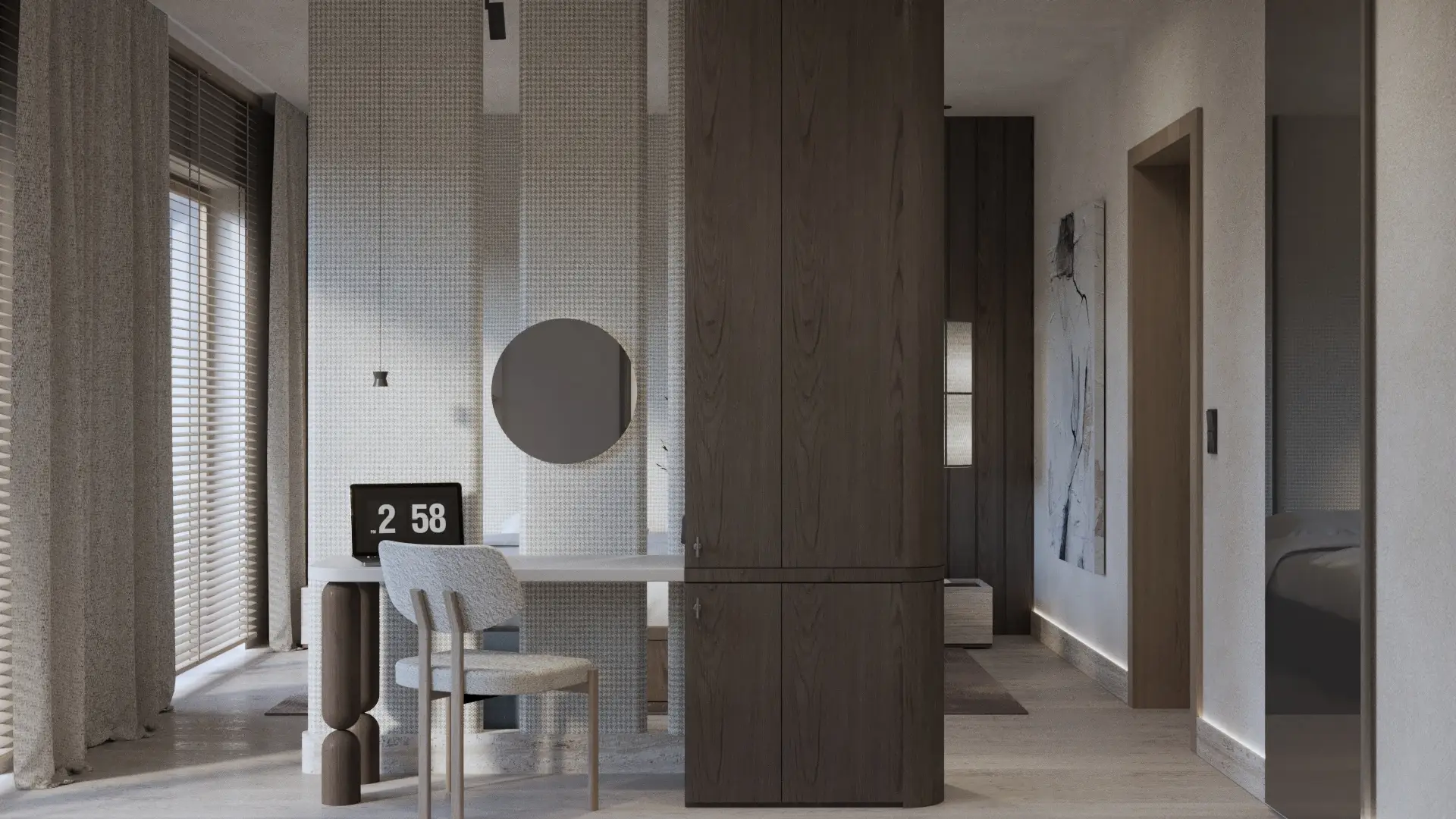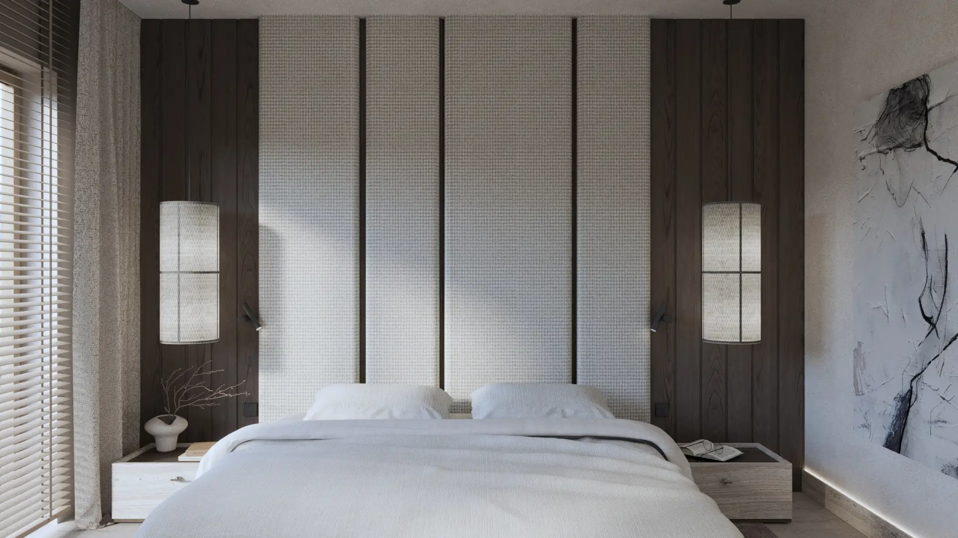 Projekt wnętrza domu łączy estetykę japandi z elementami stylu modern farmhouse, tworząc spójną i funkcjonalną przestrzeń do codziennego życia. Centralnym punktem strefy dziennej jest duży drewniany stół , sprzyjający wspólnym posiłkom i spotkaniom. Modułowa sofa, ustawiona na tle dekoracyjnego regału, została zorientowana tak by integrować salon, jadalnię i ogród, podkreślając wielozadaniowość tej części domu. W kuchni zaprojektowano funkcjonalną wyspę z kwarcytu Taj Mahal, długi blat oraz wysoką zabudowę z forniru dębowego, która mieści sprzęty AGD i barek kawowy. Wyjątkowym elementem są wysokie szklane drzwi do wiatrołapu w drewnianej ramie oraz ozdobna kompozycja z konsolą i obrazem. Nieregularnie rozmieszczone oświetlenie w korytarzu, optycznie skraca przestrzeń i dodaje jej przytulności. W sypialni zaprojektowano ażurową ściankę oddzielającą strefy.. Nastrojowe żaluzje i mięsiste zasłony wprowadzają przytulny klimat sprzyjający wyciszeniu oraz poprawiają akustykę. W garderobie znajduje się duża szafa z podświetlanym wnętrzem, małe biurko i duże lustro, które odbija światło z okna. Łazienka master została wyposażona w dużą kabinę prysznicową, podświetlane lustra, monolityczną umywalkę oraz drewniane elementy meblowe. Wyjątkowy klimat do relaksu zapewnia podwieszana wanna osadzona w klimatycznie podświetlanej niszy z elegancką tapetą i kinkietami.