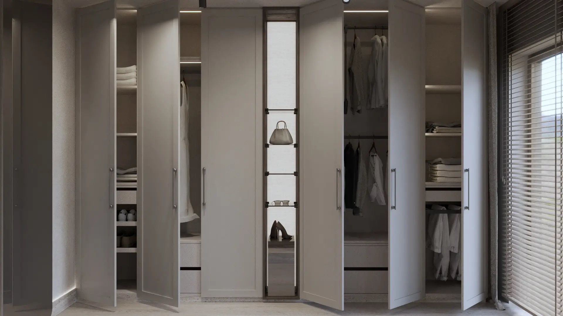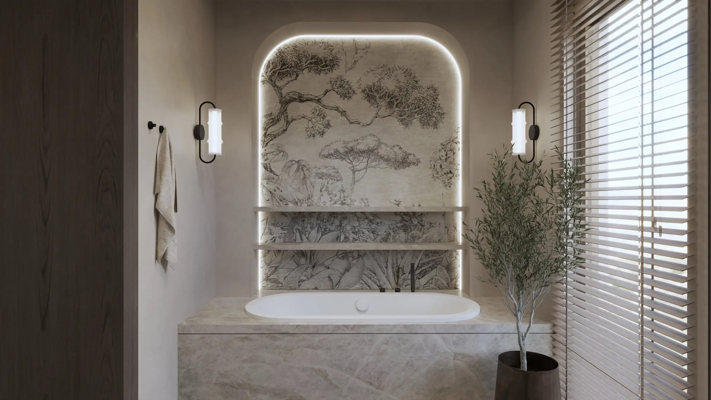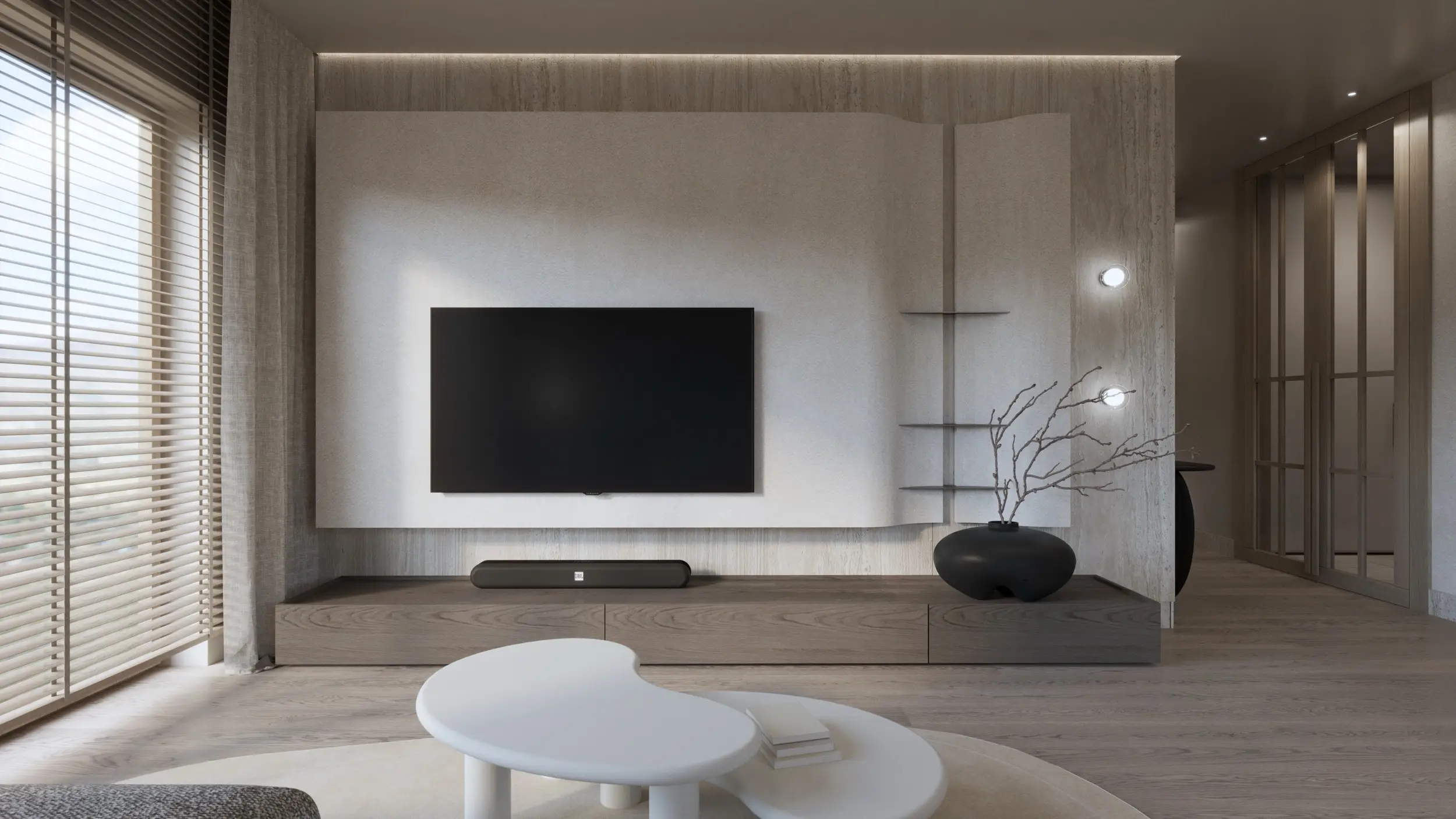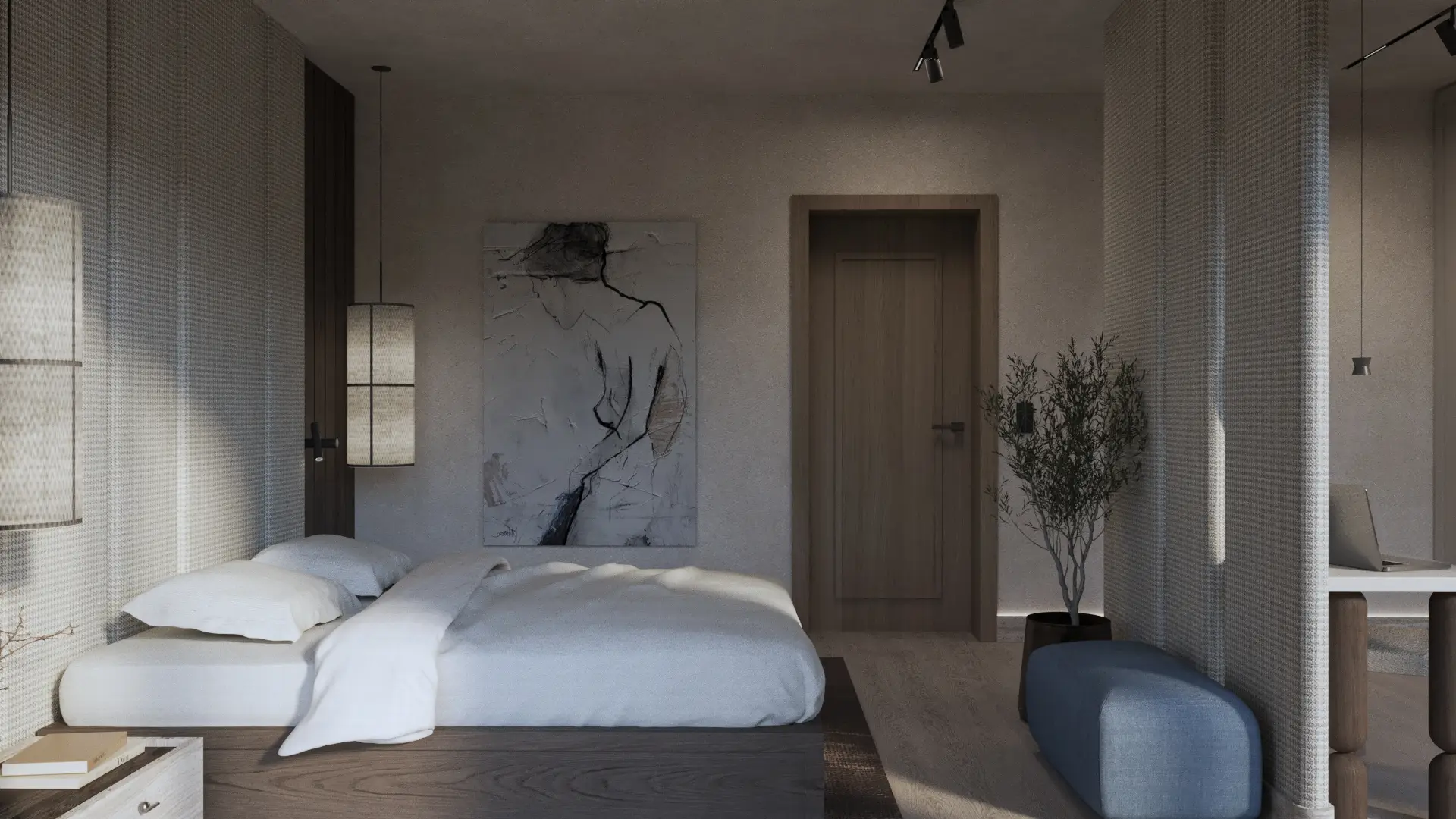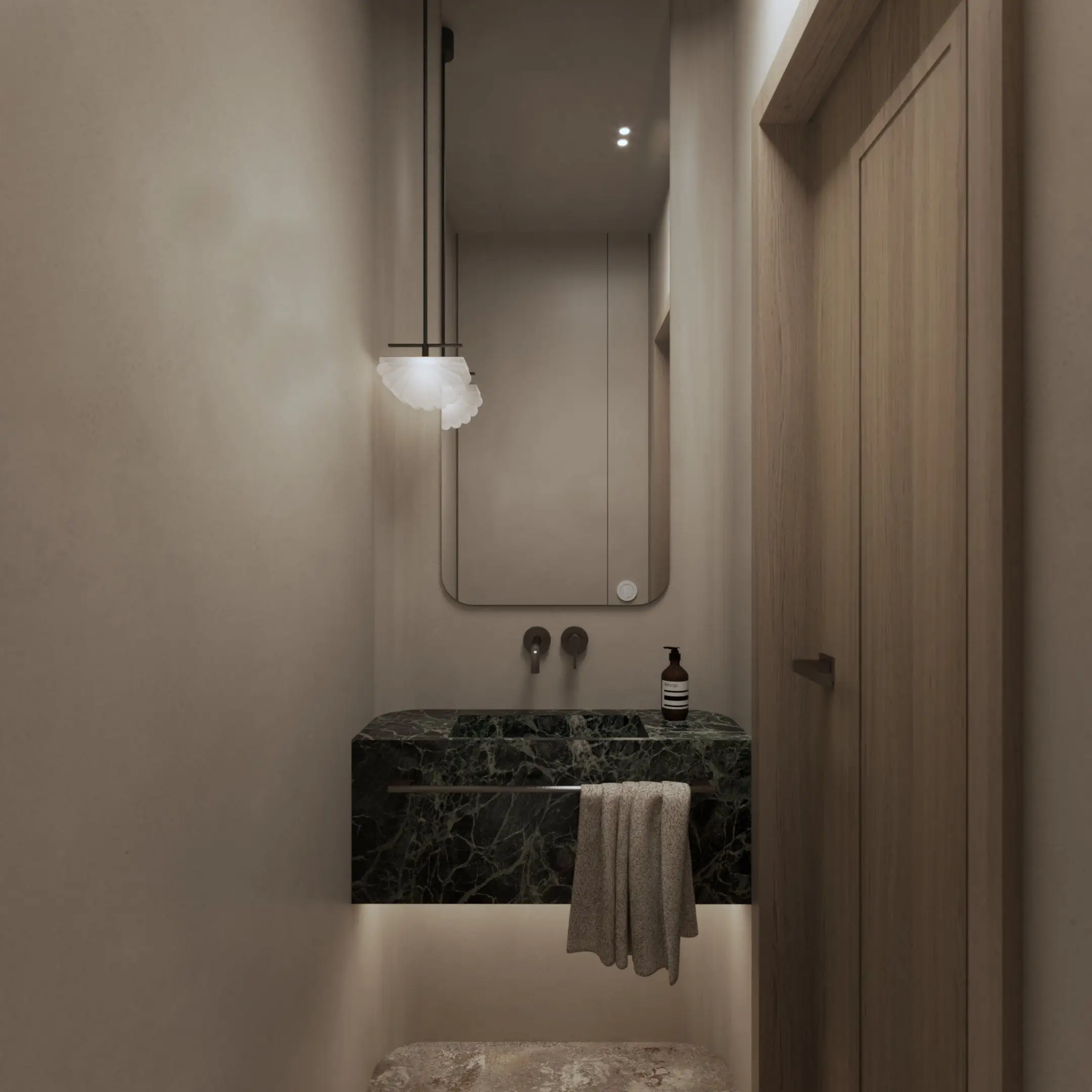 Projekt wnętrza domu łączy estetykę japandi z elementami stylu modern farmhouse, tworząc spójną i funkcjonalną przestrzeń do codziennego życia. Centralnym punktem strefy dziennej jest duży drewniany stół , sprzyjający wspólnym posiłkom i spotkaniom. Modułowa sofa, ustawiona na tle dekoracyjnego regału, została zorientowana tak by integrować salon, jadalnię i ogród, podkreślając wielozadaniowość tej części domu. W kuchni zaprojektowano funkcjonalną wyspę z kwarcytu Taj Mahal, długi blat oraz wysoką zabudowę z forniru dębowego, która mieści sprzęty AGD i barek kawowy. Wyjątkowym elementem są wysokie szklane drzwi do wiatrołapu w drewnianej ramie oraz ozdobna kompozycja z konsolą i obrazem. Nieregularnie rozmieszczone oświetlenie w korytarzu, optycznie skraca przestrzeń i dodaje jej przytulności. W sypialni zaprojektowano ażurową ściankę oddzielającą strefy.. Nastrojowe żaluzje i mięsiste zasłony wprowadzają przytulny klimat sprzyjający wyciszeniu oraz poprawiają akustykę. W garderobie znajduje się duża szafa z podświetlanym wnętrzem, małe biurko i duże lustro, które odbija światło z okna. Łazienka master została wyposażona w dużą kabinę prysznicową, podświetlane lustra, monolityczną umywalkę oraz drewniane elementy meblowe. Wyjątkowy klimat do relaksu zapewnia podwieszana wanna osadzona w klimatycznie podświetlanej niszy z elegancką tapetą i kinkietami.