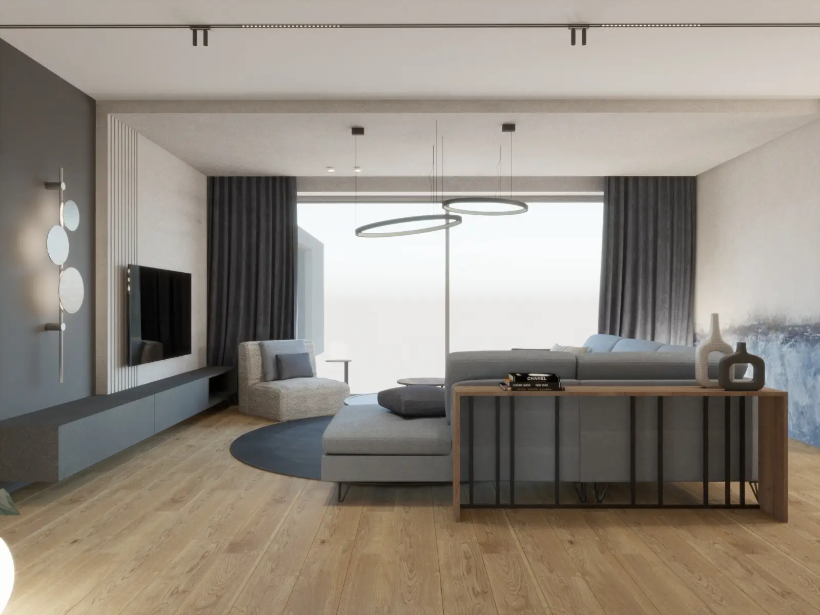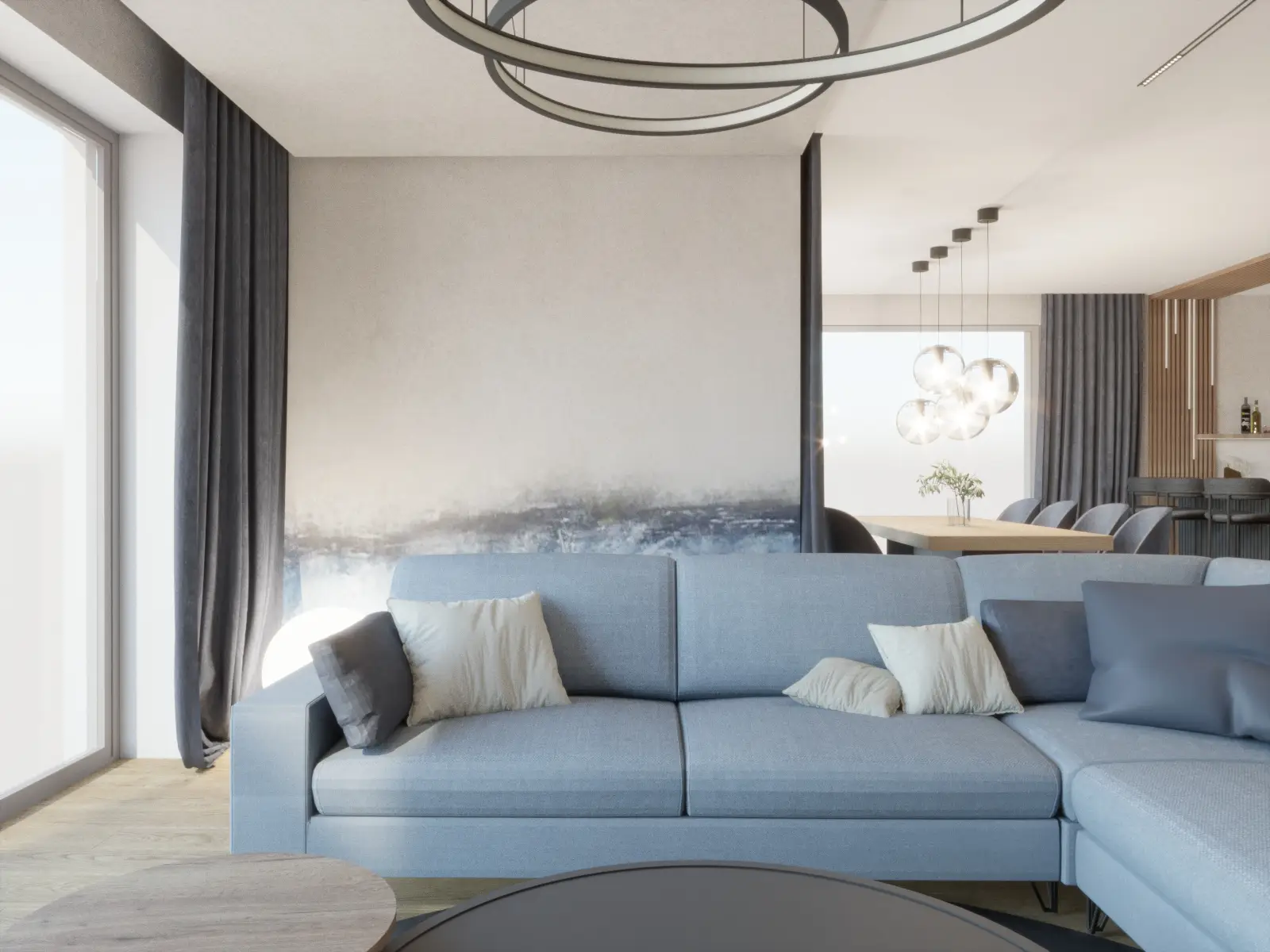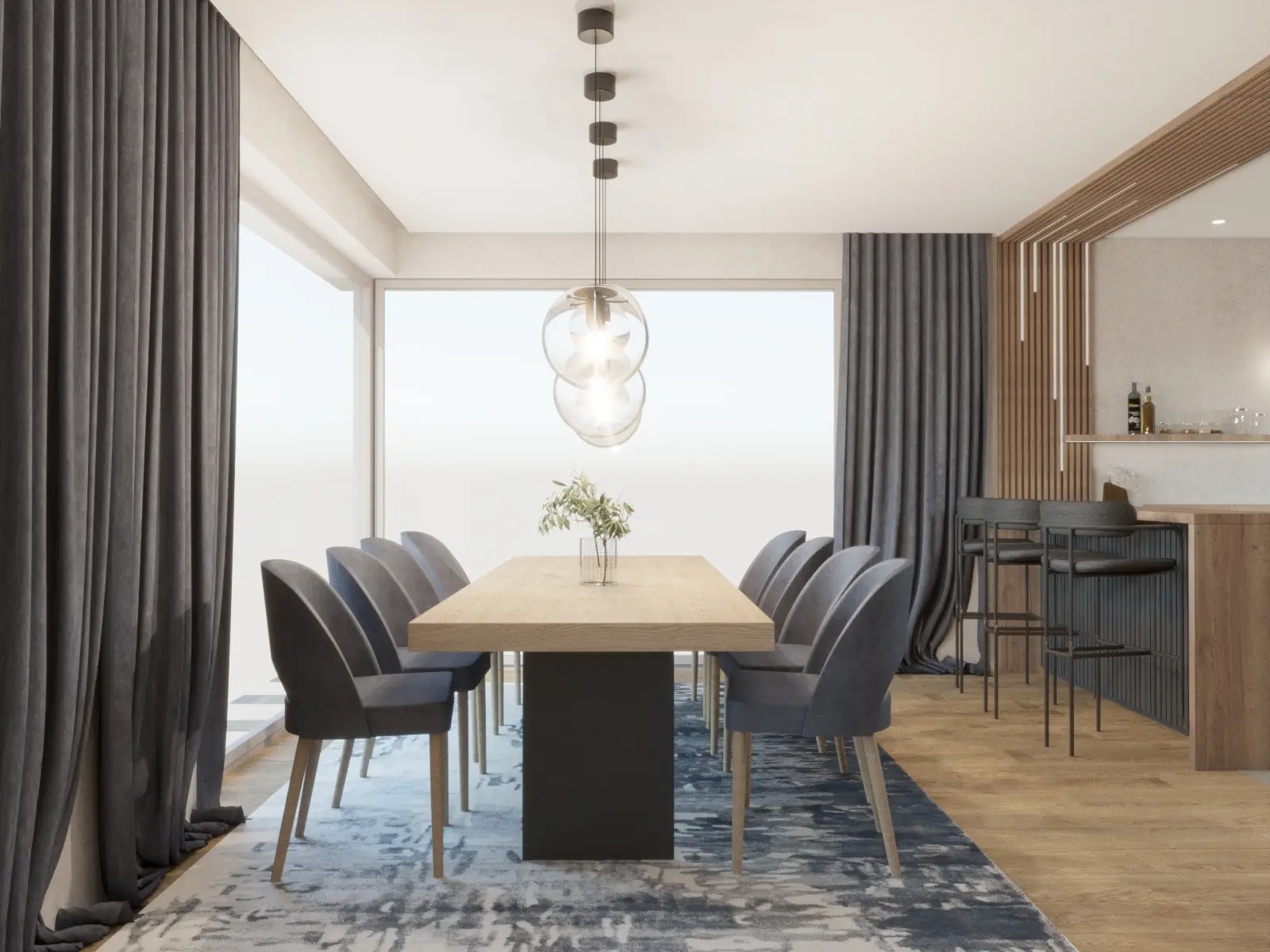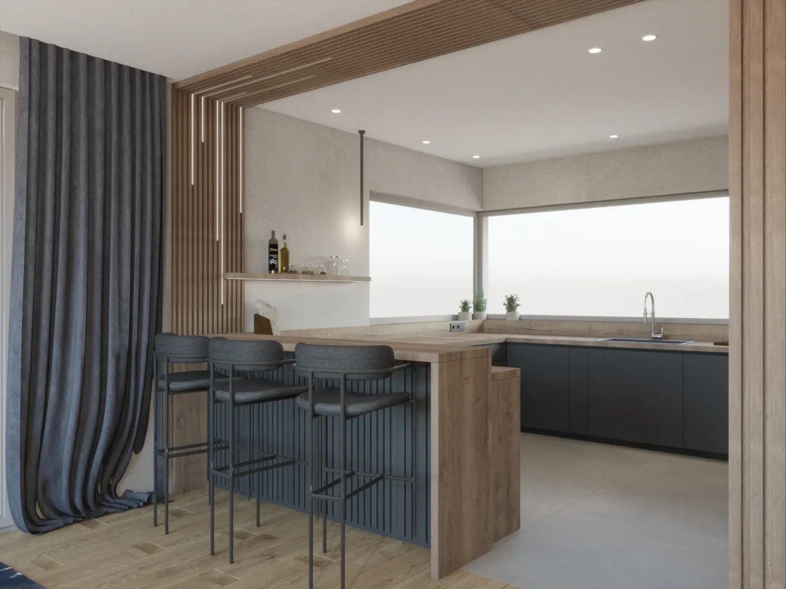 Ten nowoczesny dom to połączenie ciepła, elegancji i funkcjonalnego designu. Przemyślane rozmieszczenie pomieszczeń gwarantuje swobodę codziennego funkcjonowania i poczucie przestrzeni. Dominująca paleta jasnych barw, akcenty ze stali, szklane drzwi oraz eleganckie witryny wprowadzają lekkość i nowoczesny charakter, który przełamany został naturalnym drewnem obecnym na ścianach. Nowoczesne dodatki w tonacjach grafitu, głębokiego granatu i miękkiego błękitu podkreślają wyrafinowaną estetykę projektu. Sercem domu jest przestronny salon z otwartą kuchnią i jadalnią. Centralne miejsce w salonie podkreśla obniżona rama sufitu podwieszanego, płynnie przechodząca w dekoracyjną ścianę TV. Stylowy, niebieski narożnik, pomieści całą rodzinę podczas seansów filmowych a dekoracyjna ściana w tle spójnie łączy kolorystykę. Kuchnia została zaprojektowana z naciskiem na ergonomię – wysoka zabudowa kryje sprzęty AGD oraz ukryte wejście do spiżarni, a narożne okna doskonale doświetlają przestronny blat roboczy. Płyta grzewcza zintegrowana z pochłaniaczem pozwoliła na zachowanie czystej formy. Ciężkie, granatowe zasłony uzupełniają wnętrze, podkreślając pionowe linie a także sprzyjają akustyce całej przestrzeni. Starannie zaplanowane oświetlenie wydziela strefy, dopełnia kompozycję, tworząc wnętrze eleganckie, nowoczesne i komfortowe.