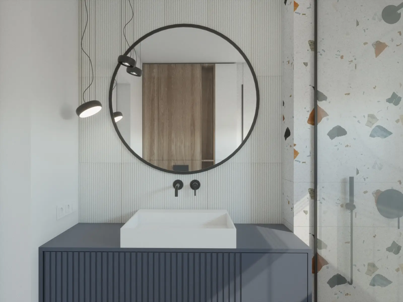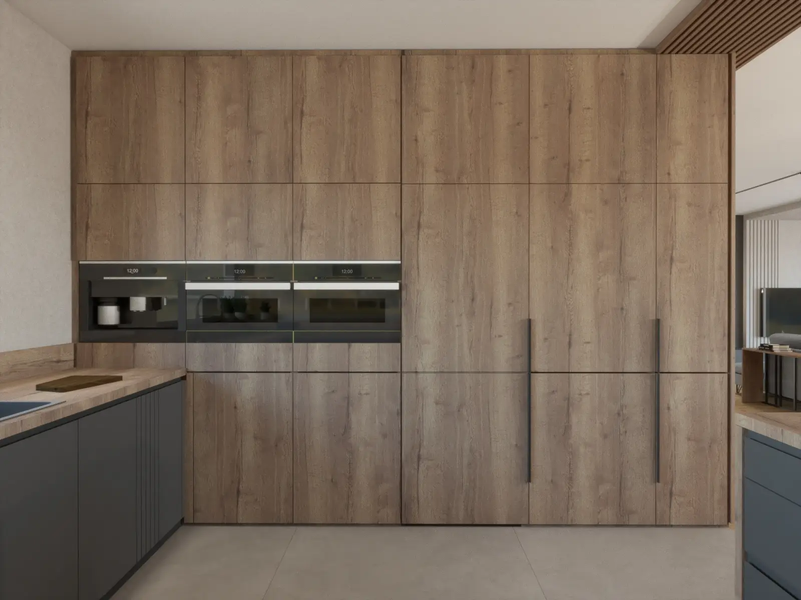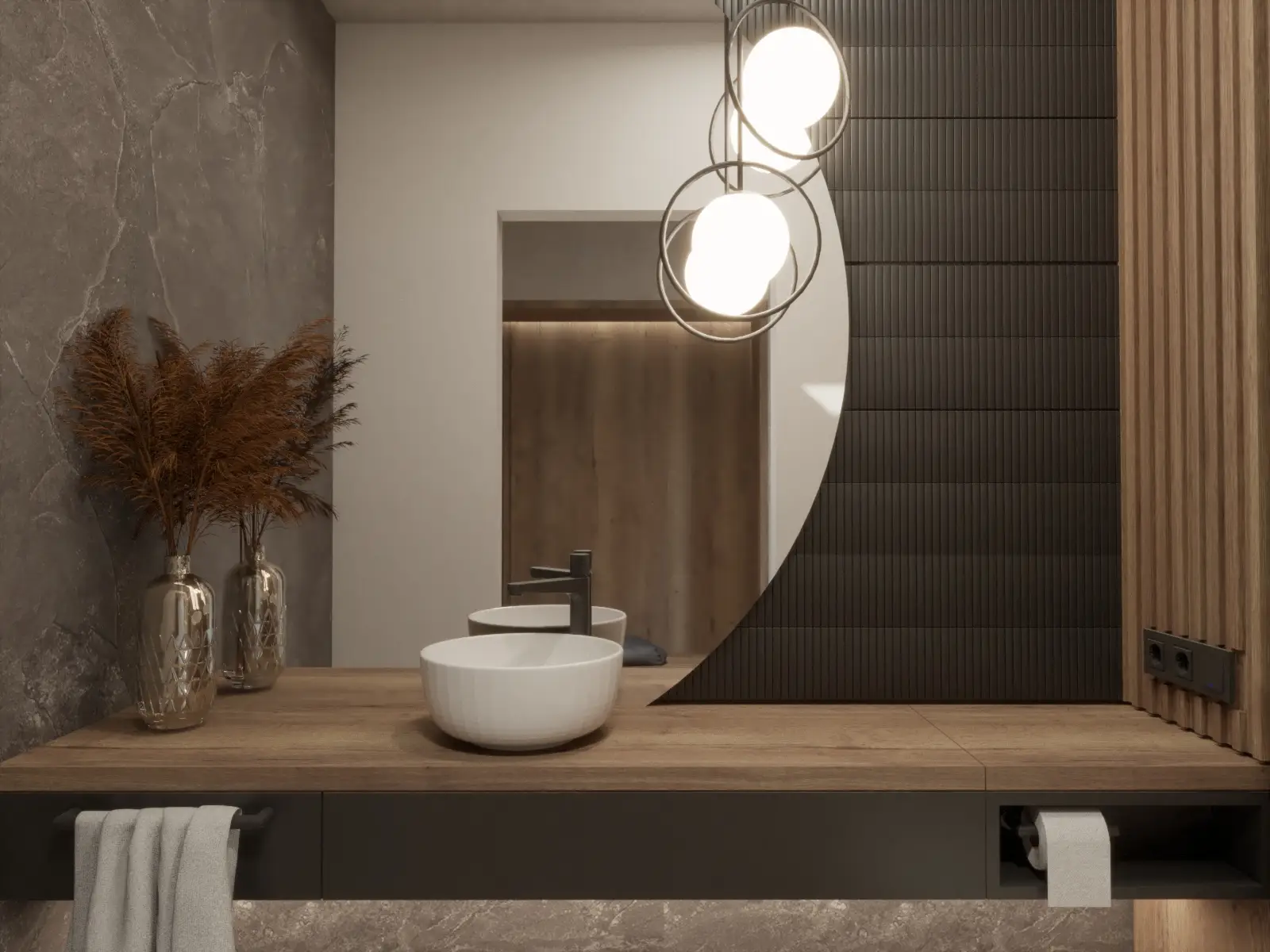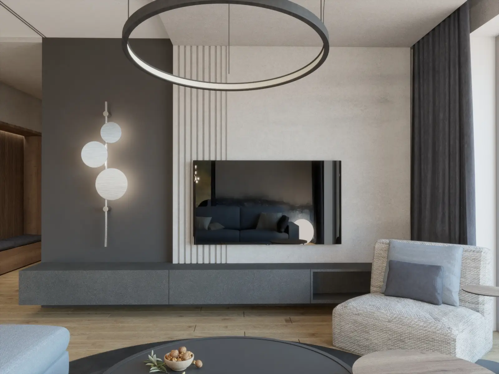Ten nowoczesny dom to połączenie ciepła, elegancji i funkcjonalnego designu. Przemyślane rozmieszczenie pomieszczeń gwarantuje swobodę codziennego funkcjonowania i poczucie przestrzeni. Dominująca paleta jasnych barw, akcenty ze stali, szklane drzwi oraz eleganckie witryny wprowadzają lekkość i nowoczesny charakter, który przełamany został naturalnym drewnem obecnym na ścianach. Nowoczesne dodatki w tonacjach grafitu, głębokiego granatu i miękkiego błękitu podkreślają wyrafinowaną estetykę projektu. Sercem domu jest przestronny salon z otwartą kuchnią i jadalnią. Centralne miejsce w salonie podkreśla obniżona rama sufitu podwieszanego, płynnie przechodząca w dekoracyjną ścianę TV. Stylowy, niebieski narożnik, pomieści całą rodzinę podczas seansów filmowych a dekoracyjna ściana w tle spójnie łączy kolorystykę. Kuchnia została zaprojektowana z naciskiem na ergonomię – wysoka zabudowa kryje sprzęty AGD oraz ukryte wejście do spiżarni, a narożne okna doskonale doświetlają przestronny blat roboczy. Płyta grzewcza zintegrowana z pochłaniaczem pozwoliła na zachowanie czystej formy. Ciężkie, granatowe zasłony uzupełniają wnętrze, podkreślając pionowe linie a także sprzyjają akustyce całej przestrzeni. Starannie zaplanowane oświetlenie wydziela strefy, dopełnia kompozycję, tworząc wnętrze eleganckie, nowoczesne i komfortowe.