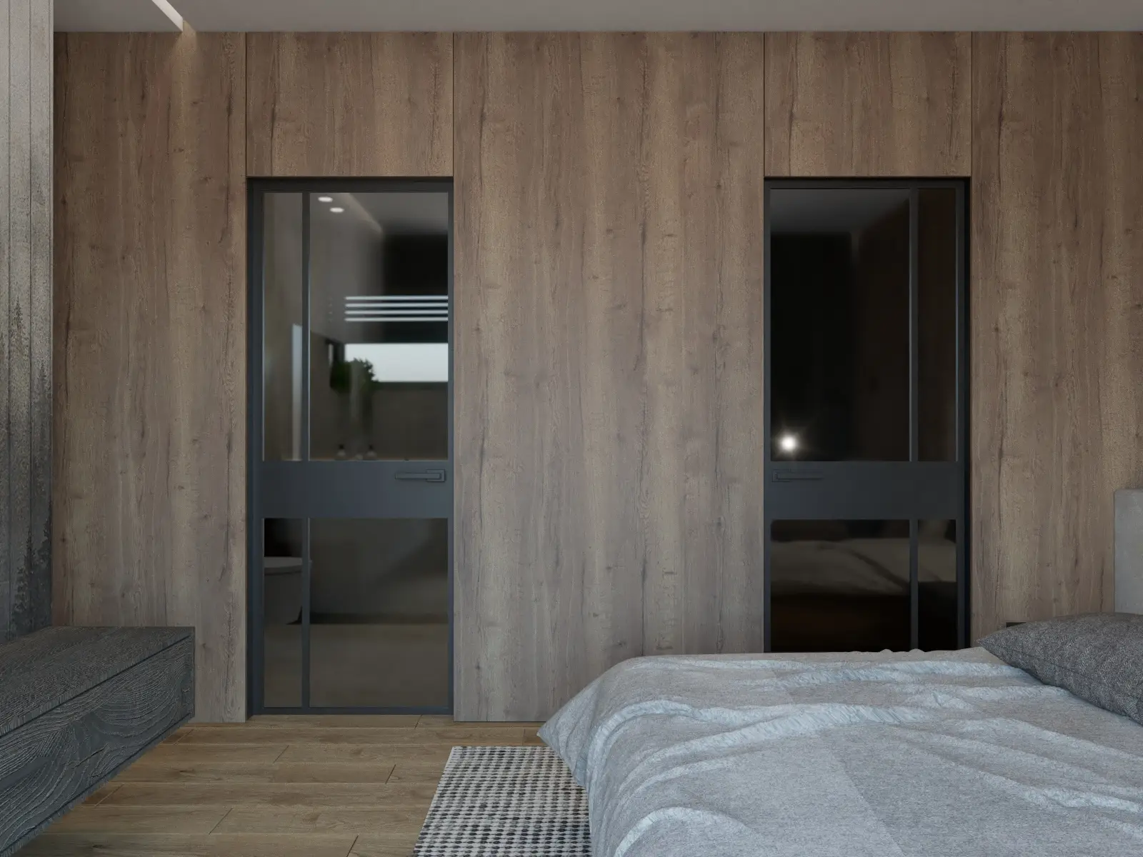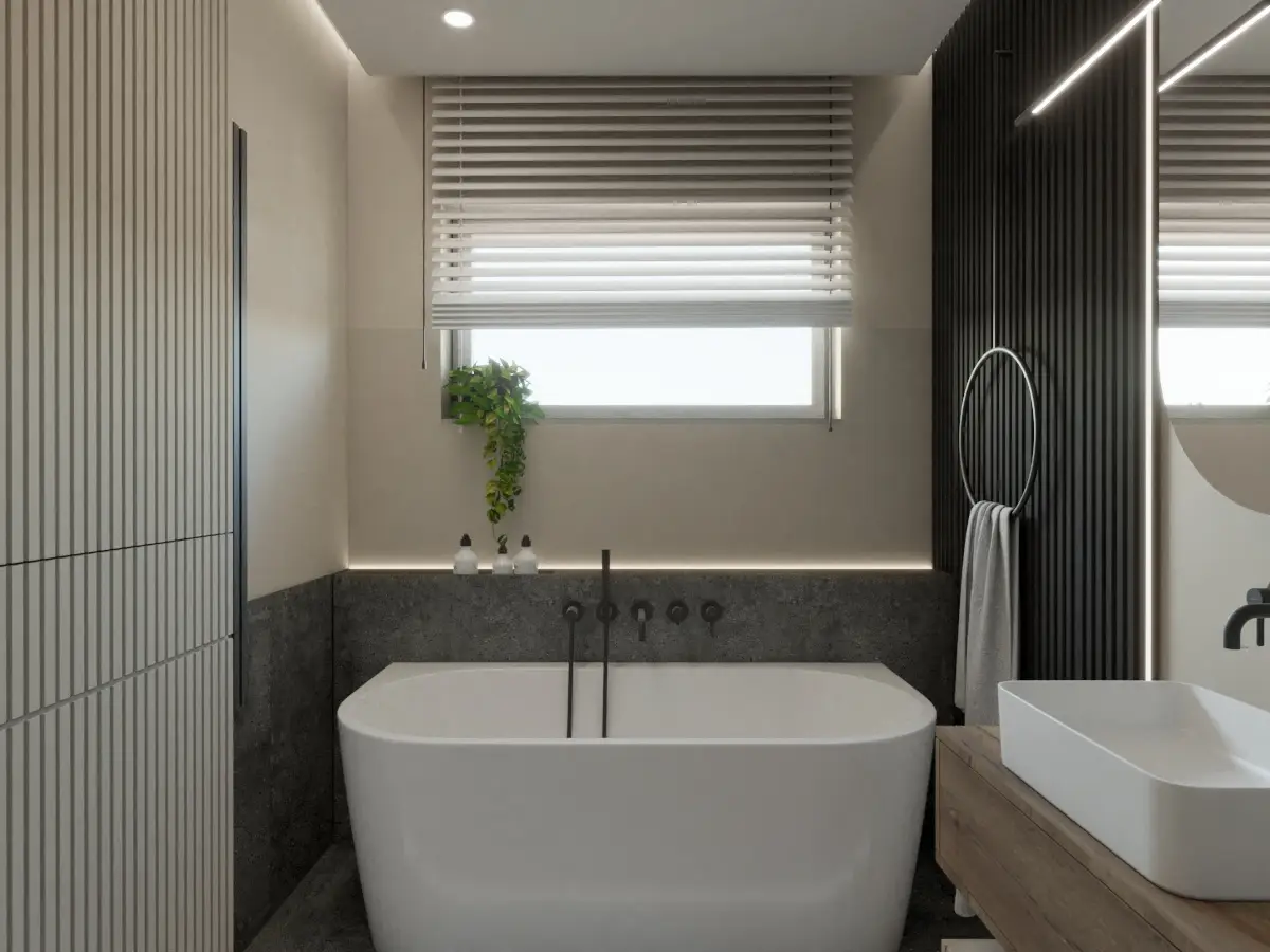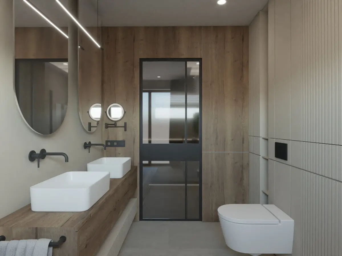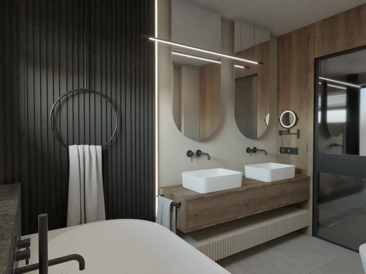 Strefa prywatna obejmująca sypialnię i łazienkę master, pozostaje w spójnej stylistyce przy zachowaniu maksymalnej efektywności przestrzeni. Każdy detal wnętrza został zaprojektowany z myślą o estetyce i komforcie użytkowania. To dom, który łączy nowoczesność z ponadczasową elegancją, tworząc wyjątkową przestrzeń do życia.
