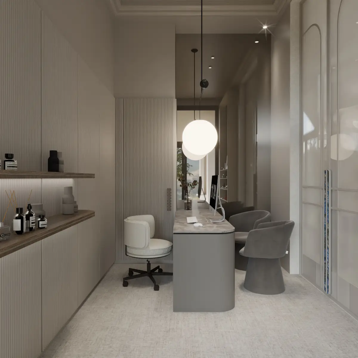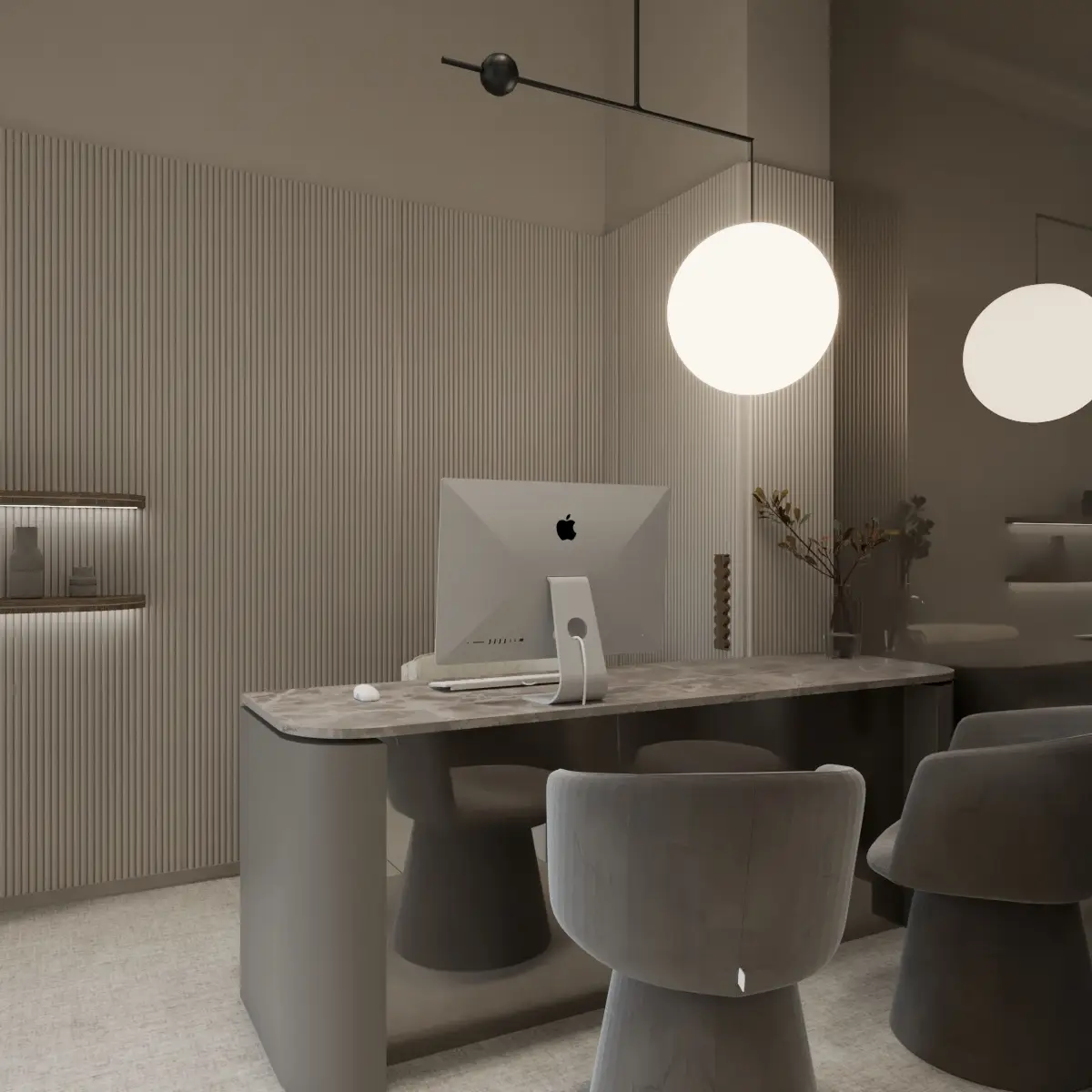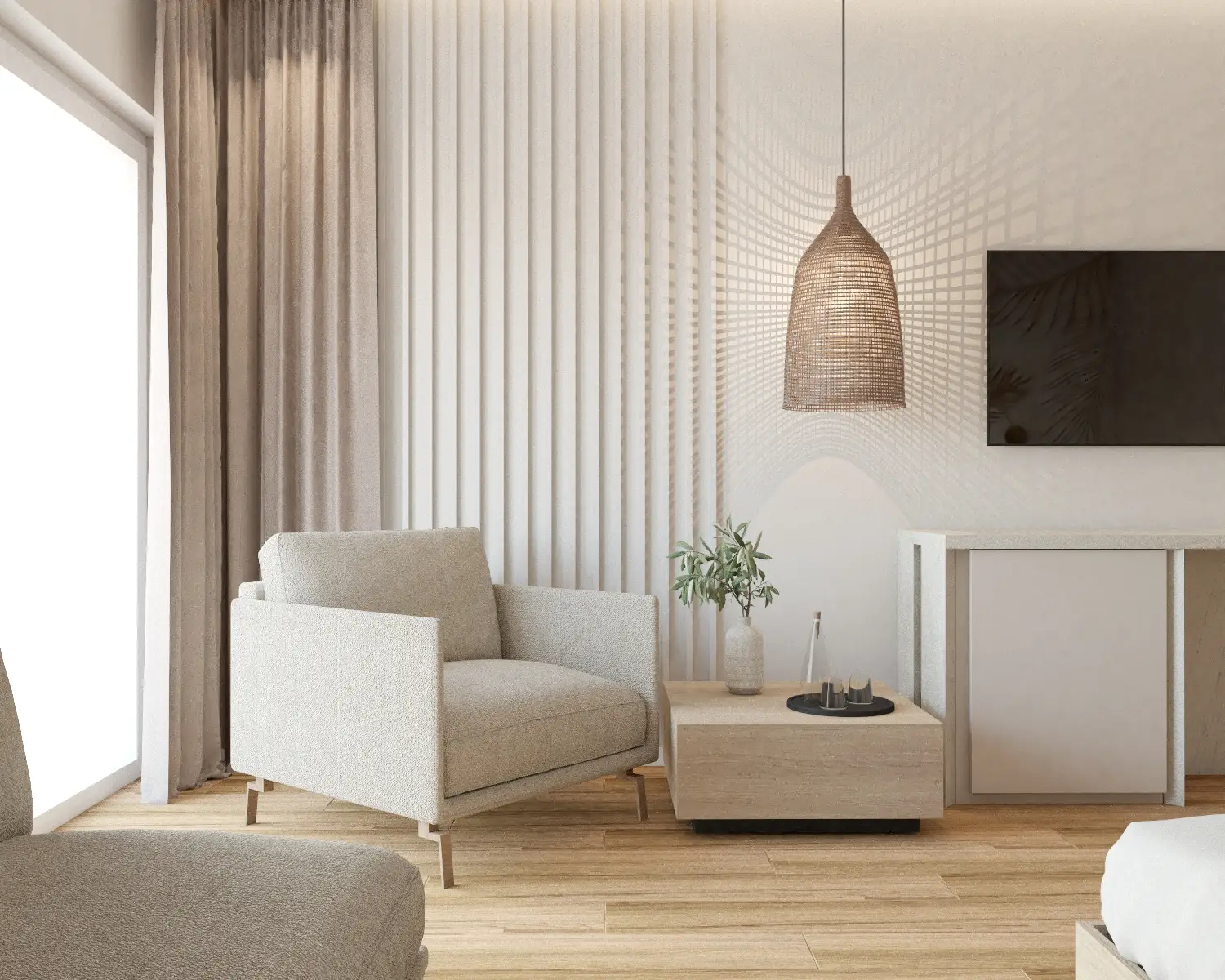 Projekt wnętrz dla Hotelu Binkowski obejmował koncepcję strefy SPA oraz pokoi hotelowych, łącząc naturalne materiały z ciepłą, przytulną atmosferą. W pokojach postawiono na delikatny styl boho – pojawiają się tu rattanowe lampy, miękkie tekstylia oraz tapety z motywem palmowych liści, które wprowadzają relaksujący, wakacyjny klimat. Recepcja SPA już od progu zapowiada charakter miejsca – drewno na suficie, podłodze i ścianach kontrastuje z jasnobeżowym tynkiem, tworząc spójną i naturalną kompozycję. Klimat przestrzeni budują również duże rośliny doniczkowe oraz starannie dobrane oświetlenie, nadające całości egzotyczny wyraz. Punktem centralnym strefy relaksu jest gabinet kąpielowy z dwiema wannami wykonanymi z brazylijskiego kamienia rzecznego, osadzonymi na podeście z jasnego kamienia. Zaokrąglone narożniki ścian, podłogi z egzotycznego drewna oraz nastrojowe światło sprawiają, że przestrzeń koi zmysły i sprzyja głębokiemu wypoczynkowi.